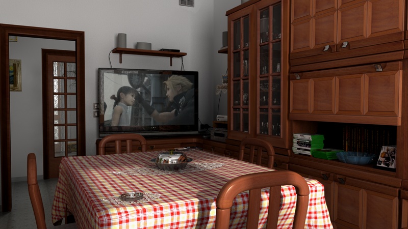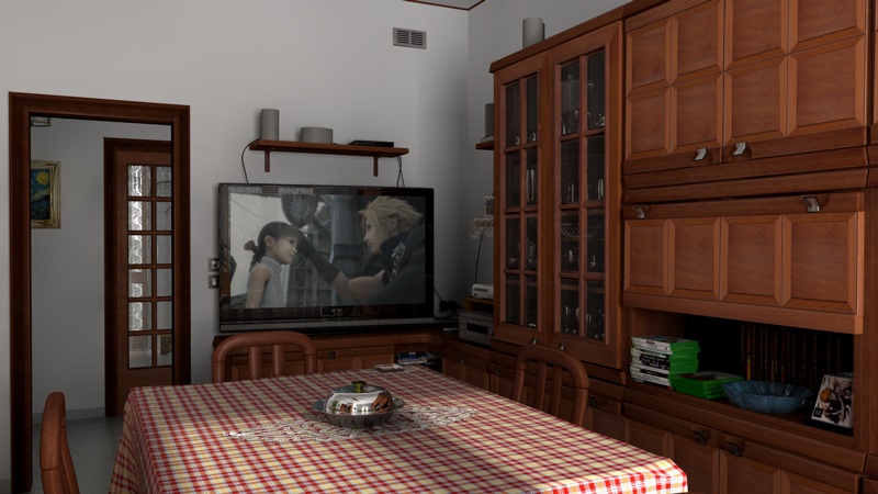 Render con inquadrature abbassate, diciamo che la prima è stata una prova più generale rispetto alla seconda dove ho sistemato alcune cosucce ^^ (ed ho spostato troppo la sedia vicino all'inquadratura XD). Sempre nella seconda immagine ho dovuto escludere dal render la libreria ormai inutile nella scena per avere un pò di muro libero a sinistra dell'ingresso. Che ne dici?