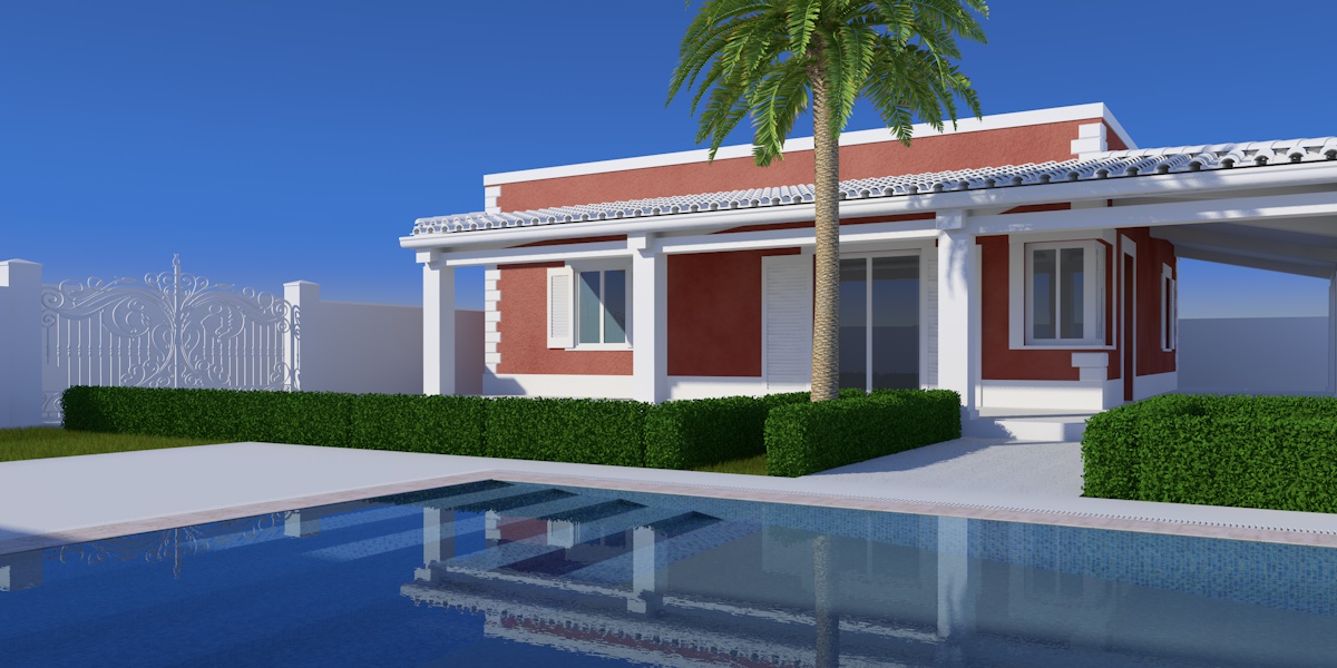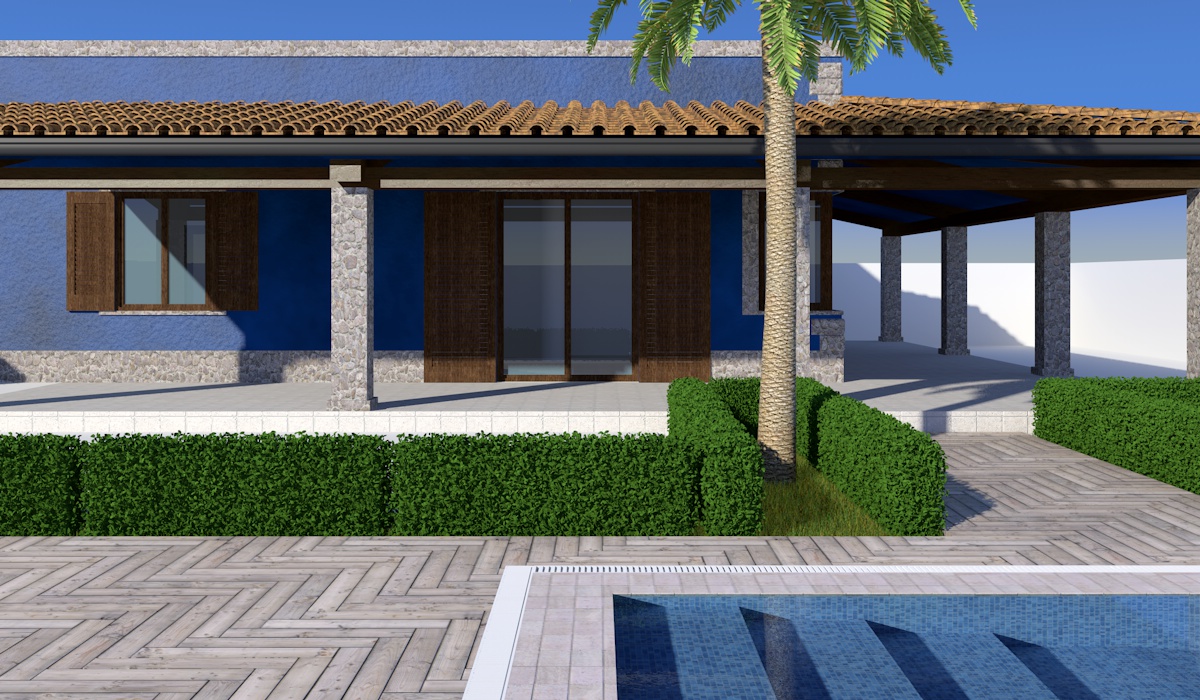 ;) La pavimentazione del portico è da rifare come misura...e anche quella del bordo piscina,non so la resa...ho aggiunto il materiale gronda e il tavolato zona piscina...non capisco perchè l'acqua piscina sembra scomparsa...c'entra che ho diminuito cache irradianza da alta dettagli a medio?perchè con l'aggiunta di cosi pochi materiali il mio macinino c'è stato quasi 20 ore dalle 12 passate? ..per quanto riguarda l'erba ho provato a rinverdirla un pò per renderla meno secca...non ci sono riuscito..ho modificato solo un pò il colore..ma non è bastato..nella texture dello speculare ho inserito colore e ho messo un colore sull'arancione(come da consiglio esperto)..è questo che dovrei modificare per rinverdire?Legno infissi e tegole che mi dite?E anche la reazione della luce con questi materiali?é da modificare?La pietra dei pilastri?..