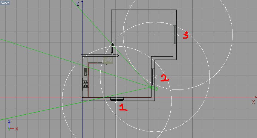 luci area in corrispondenza delle finestre con decadenza e ombre con intensità 1) 30; 2) 100; 3) 80 (come da immagine)