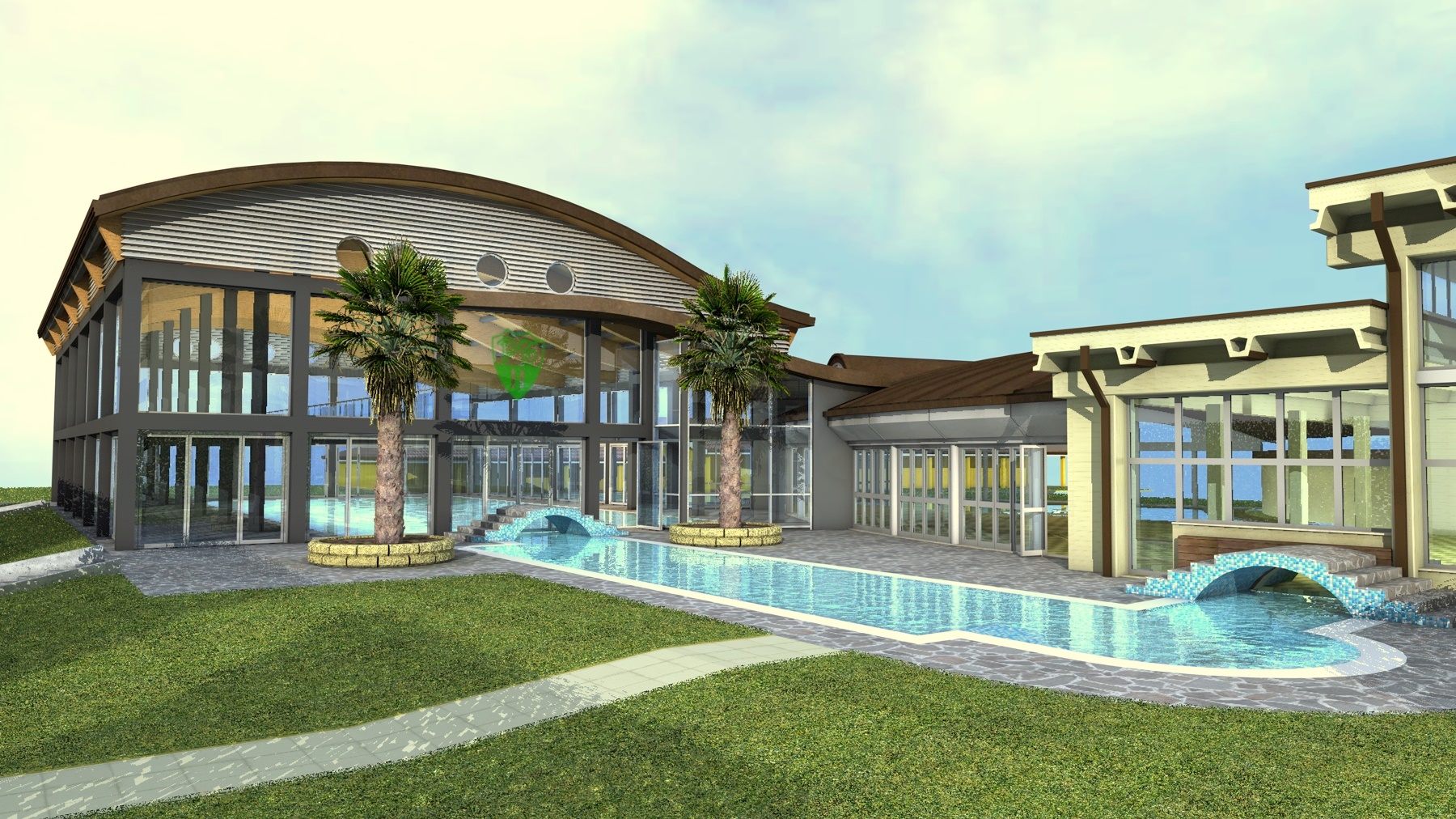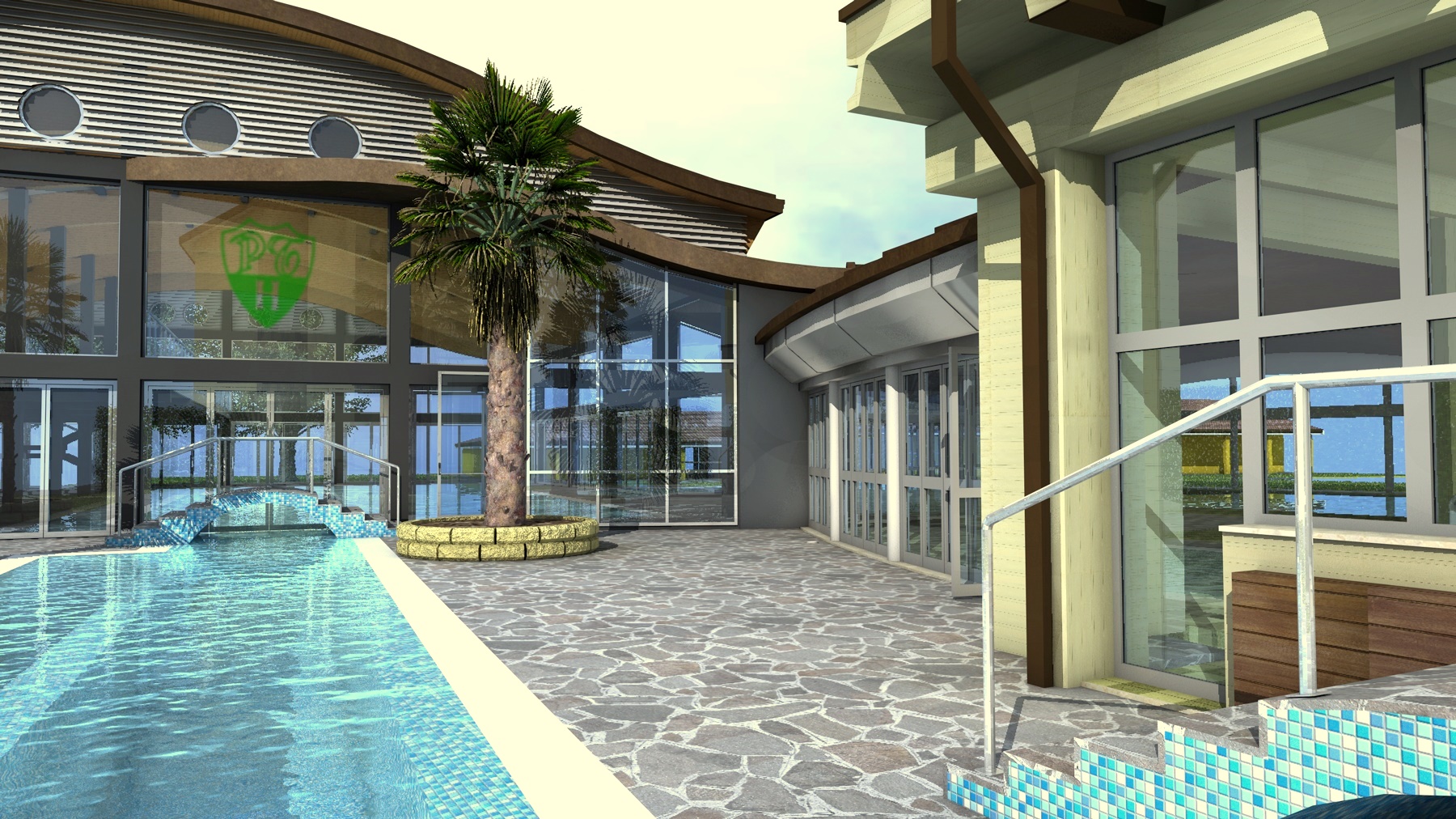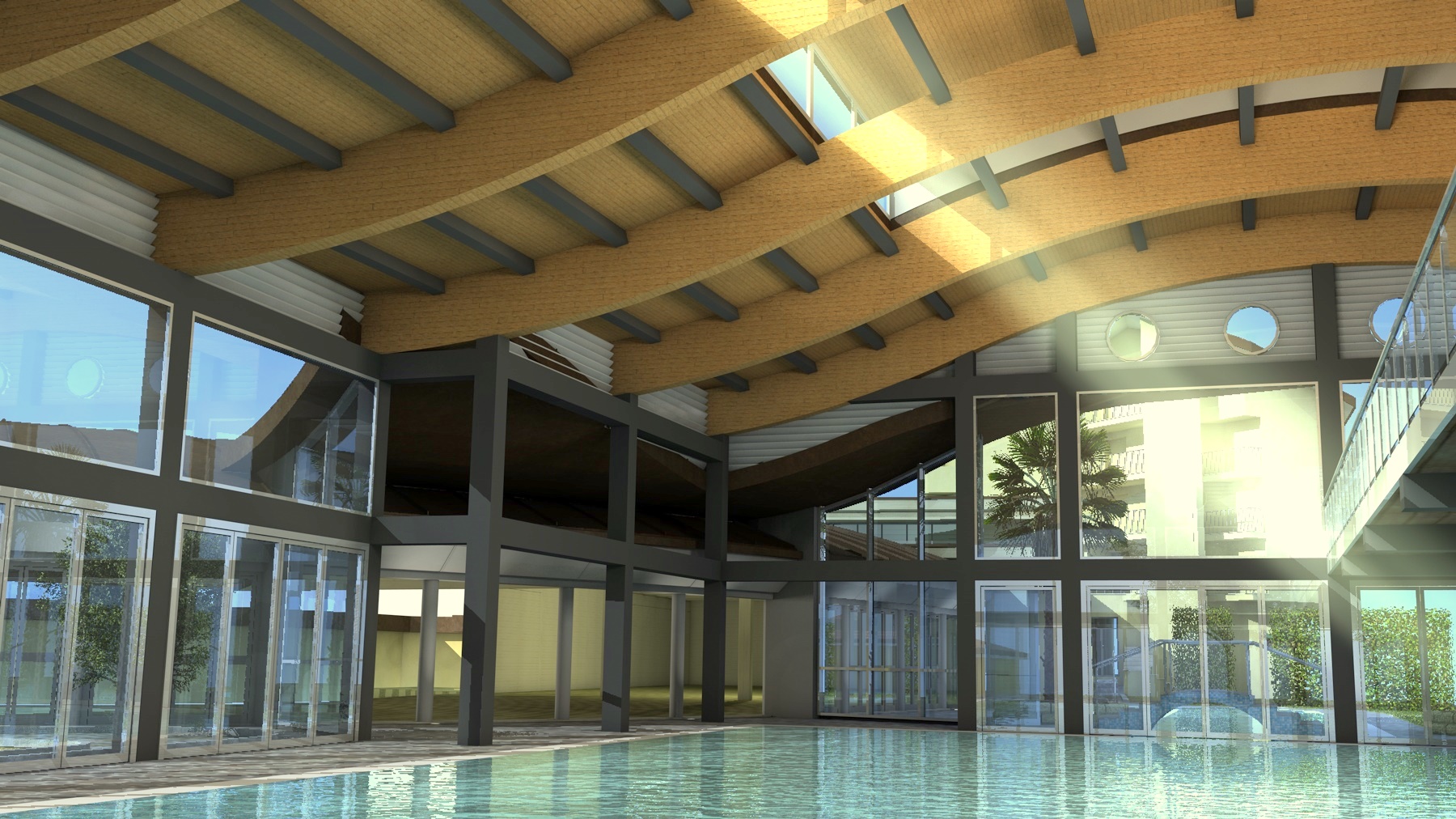 devo rendere "comprensibile" ad un cliente, la copertura di una piscina esistente. attualmente la situazione è come dai primi 2 render , e il successivo è il progetto che vorremmo realizzare. che ve ne pare?