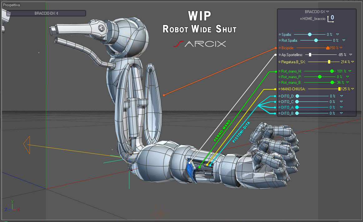 Smanettando sono anche riuscito ad ottenere una cosa che mi piaceva molto, cioè aggiungere dei pistoncini che simulassero i tendini della mano, in pratica se la mano si chiude o apre , essi ne seguono il movimento, stesso discorso per ogni singolo dito