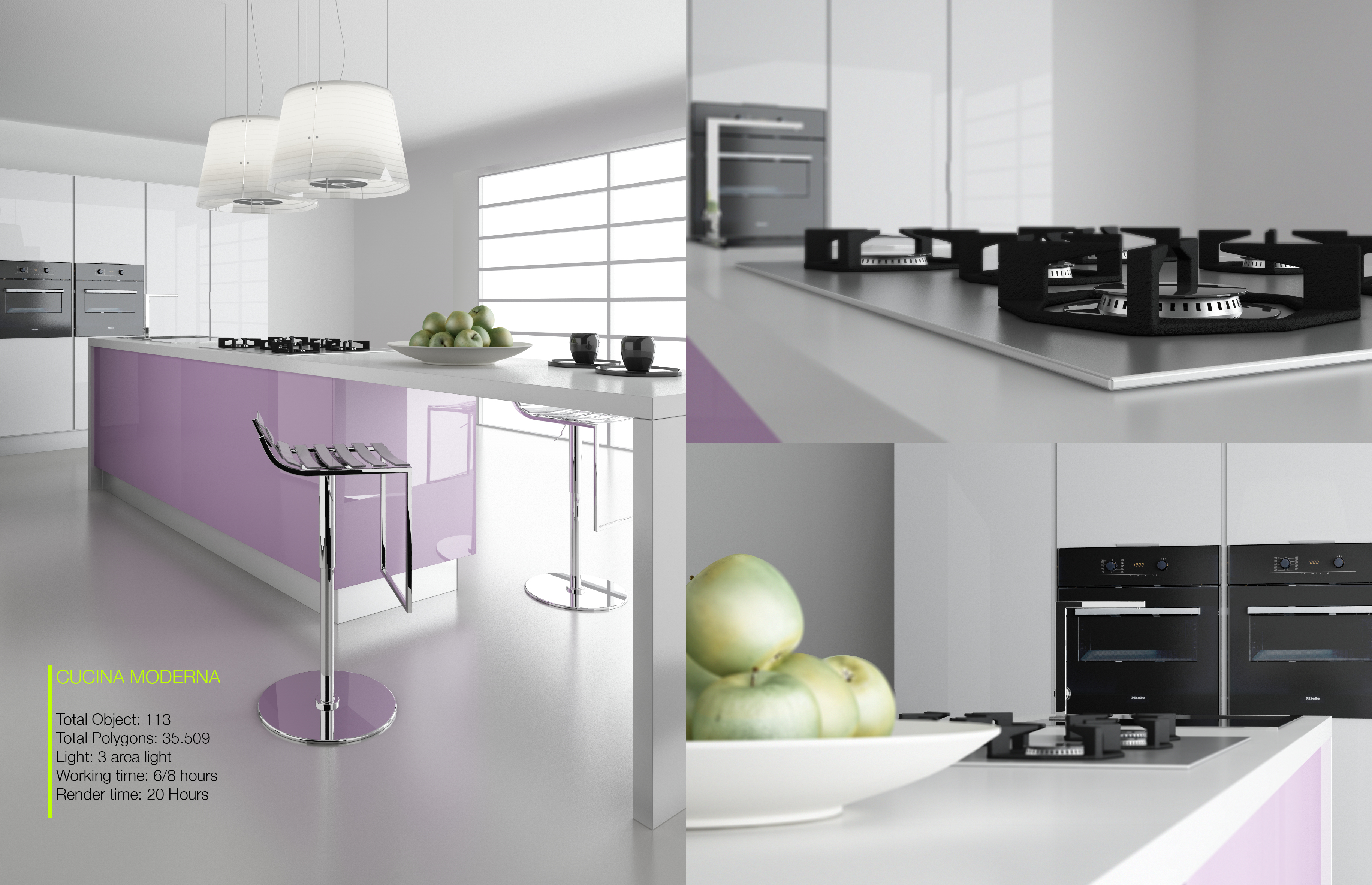 bella ma le mele sono in post? rivedi bene i fornelli sembrano troppo perfetti,ma mi posso sbagliare,sono proprio fatti cosi appoggiati sul piano d'acciaio?Per il resto mi piace bravo bravo