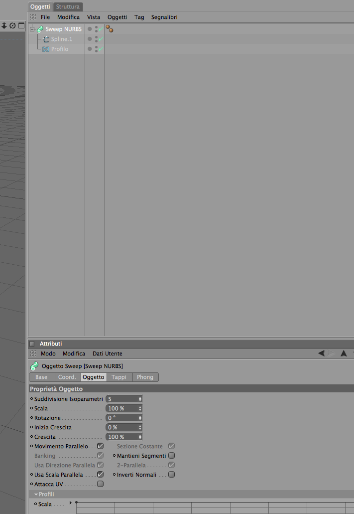 Ho pensato di prendere la lezione della cornice del quadro, quella del libro a pag. 66 67. Ho fatto una spline aperta che fingesse da guida, poi ho preso un profilo ho selezionato il parametro ad U e poi ho inserito una sweep, e poi messo tutto insieme. Bene nel parametro movimento parallelo ho messo la spunta, se no mi creava un quadrato, però vedo che il senso di orientamento è sempre lo stesso, e poi nella parte superiore non ho le ali, Dove sbaglio.