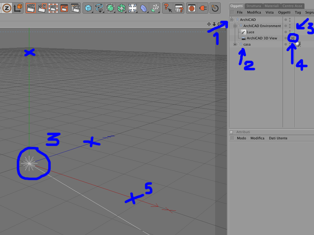 Se lo apri trovi i parametri di luce (3) e camera (4) e cliccando sul simboletto cerchiato dovrebbe "inquadrarti" il tuo oggetto. in alternativa clicca sul nome del lavoro (nel mio caso "casa" (2) e premi H. Come vedi il sole (3) è al centro del mondo e le "X" (5) che vedi sono gli assi di quest'ultimo. ArchiCAD parte sempre così.