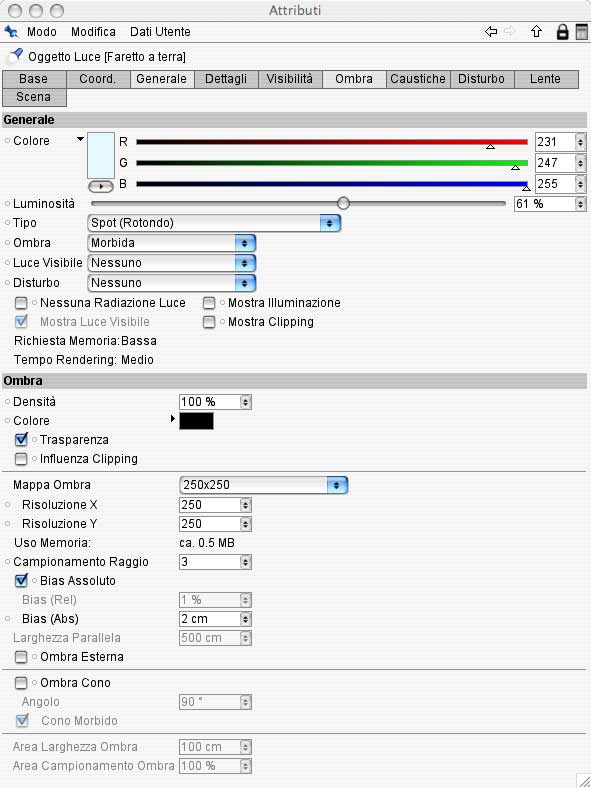 Ho introdotto sempre nella scena un luce distante con ombre di tipo area con intensità 96%.