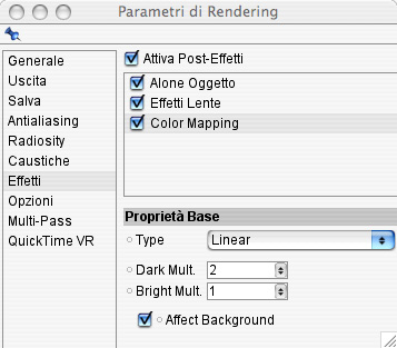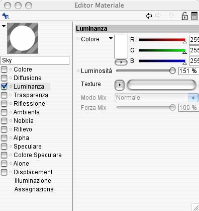 Per la scena ho utilizato per l'illuminazione un un oggetto cielo (Sky) con applicato un materiale con attivato solamente il parametri luminanza al 100%.