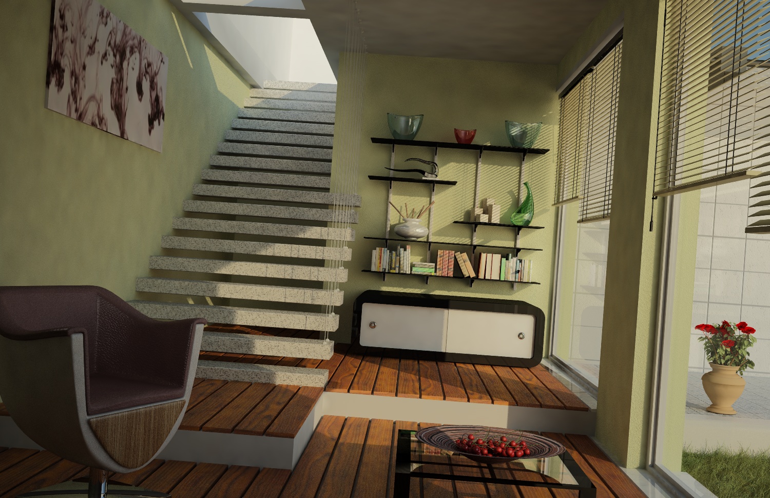 e poi si potrebbe (vedi tu) riempire la scena di elementi, chessò... libri, giornali, statuine, oggetti sparsi, cioccolatini nel piatto in primo piano... giusto per dargli un po di "vita". Vedrai che ne guadagnerà la scena e la soddisfazione personale.