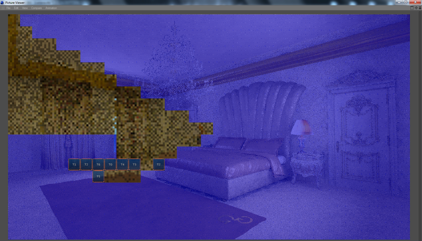 Il rendering si genera in modo tradizionale, facendo inizialmente una passata di irradiance map o lightcache.(Non mi ricordo il nome che corrisponde alla schermata che da nera si genera con dei puntini che appaiono in modo uniforme sullo schermo); però i toni del rendering sono tutti tendenti al blu.