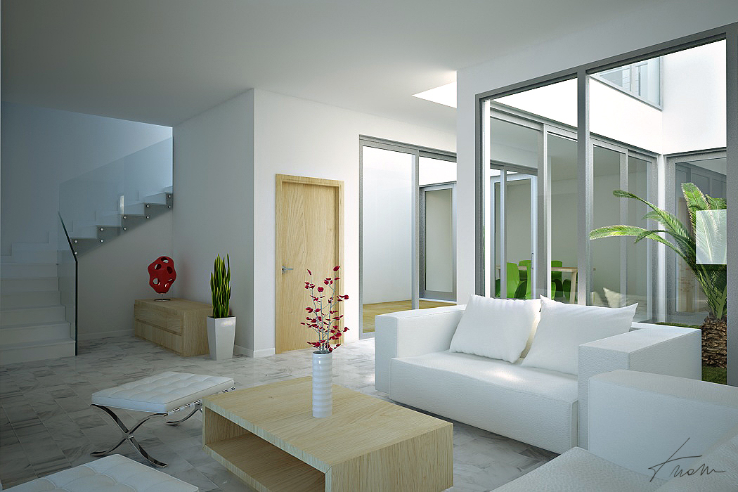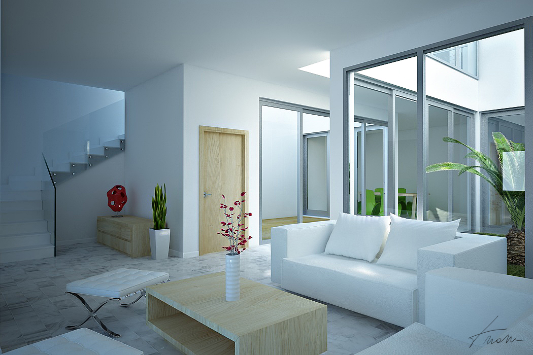 be ottimo come primo render...io cercherei di eliminare un po di azzurro nell'immagine, anche la cassettiera all'angolo della scala non è il massimo, rivedrei i cassetti sembrano strani.