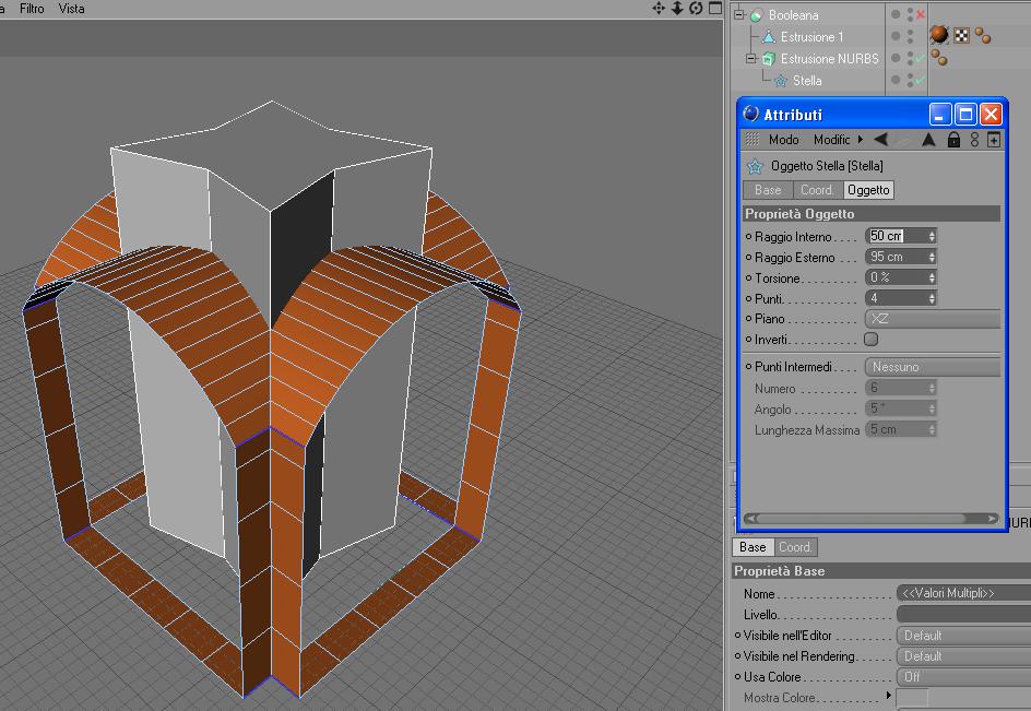 - estrudi una stella a 4 punte ruotata di 45°;centra e valuta che i punti coincidano il più possibile; prova a variare il phong in modo da limitare le distorsioni rendi modificabile