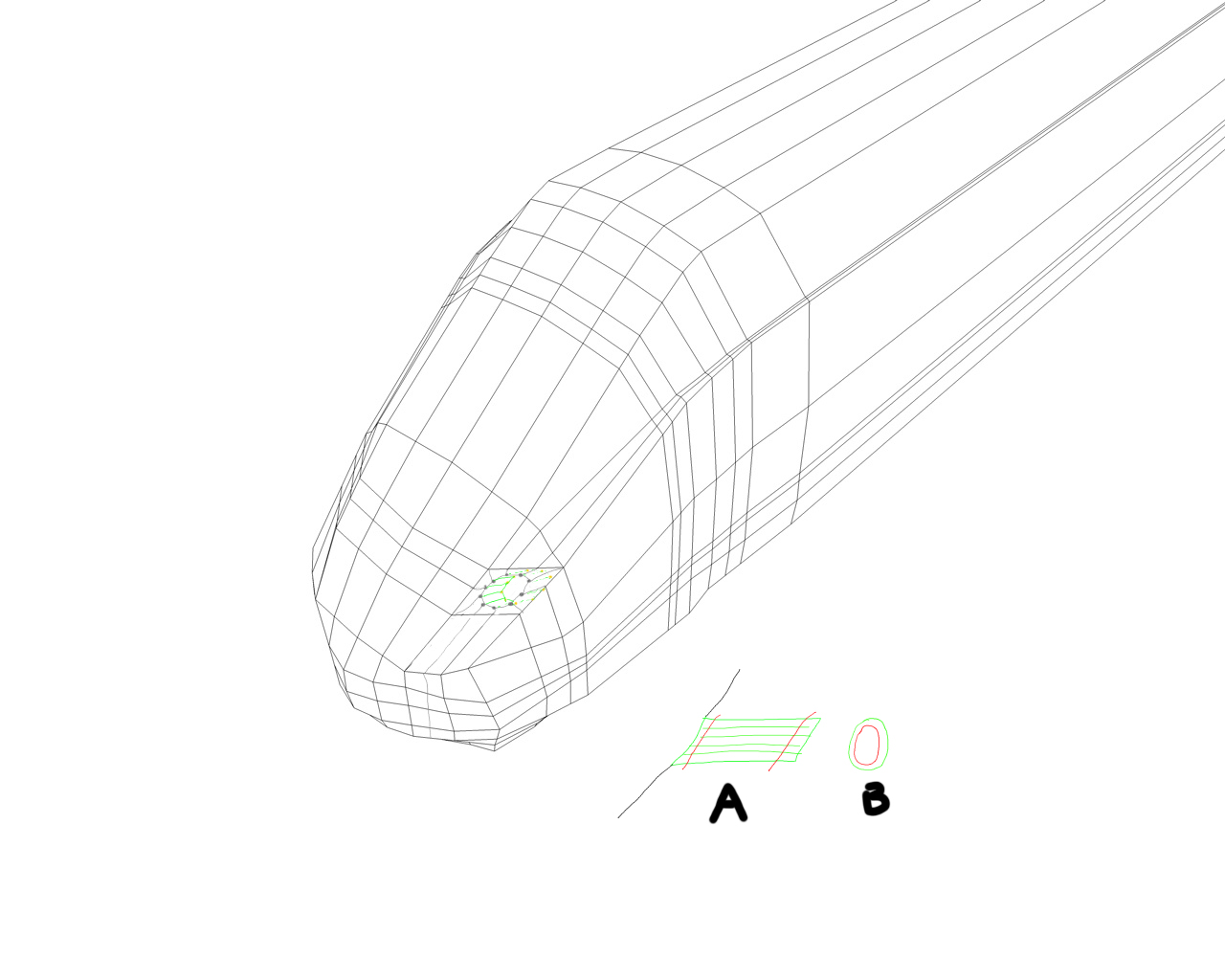 Se usi la HyperNURBS, devi creare i tagli loop (linee rosse particolare A) e una estrusione interna al poligono di fondo (colore rosso particolare B)