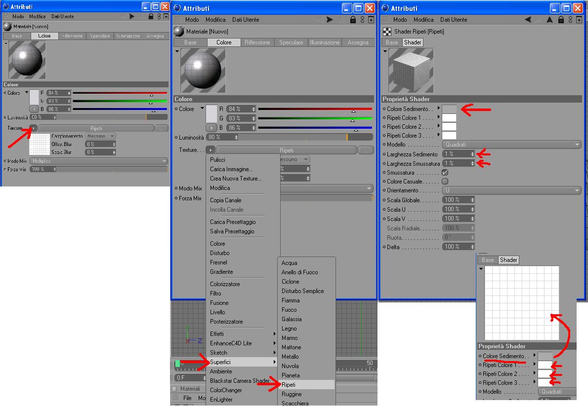 Materiale: crea un mat. con nel canale colore uno shader con superfici -> ripeti -> quadrati. Solo il primo colore (sedimento) grigio chiaro e gli altri bianchi. Sedimento e smussatura bassi, per fare la linea sottile e netta.