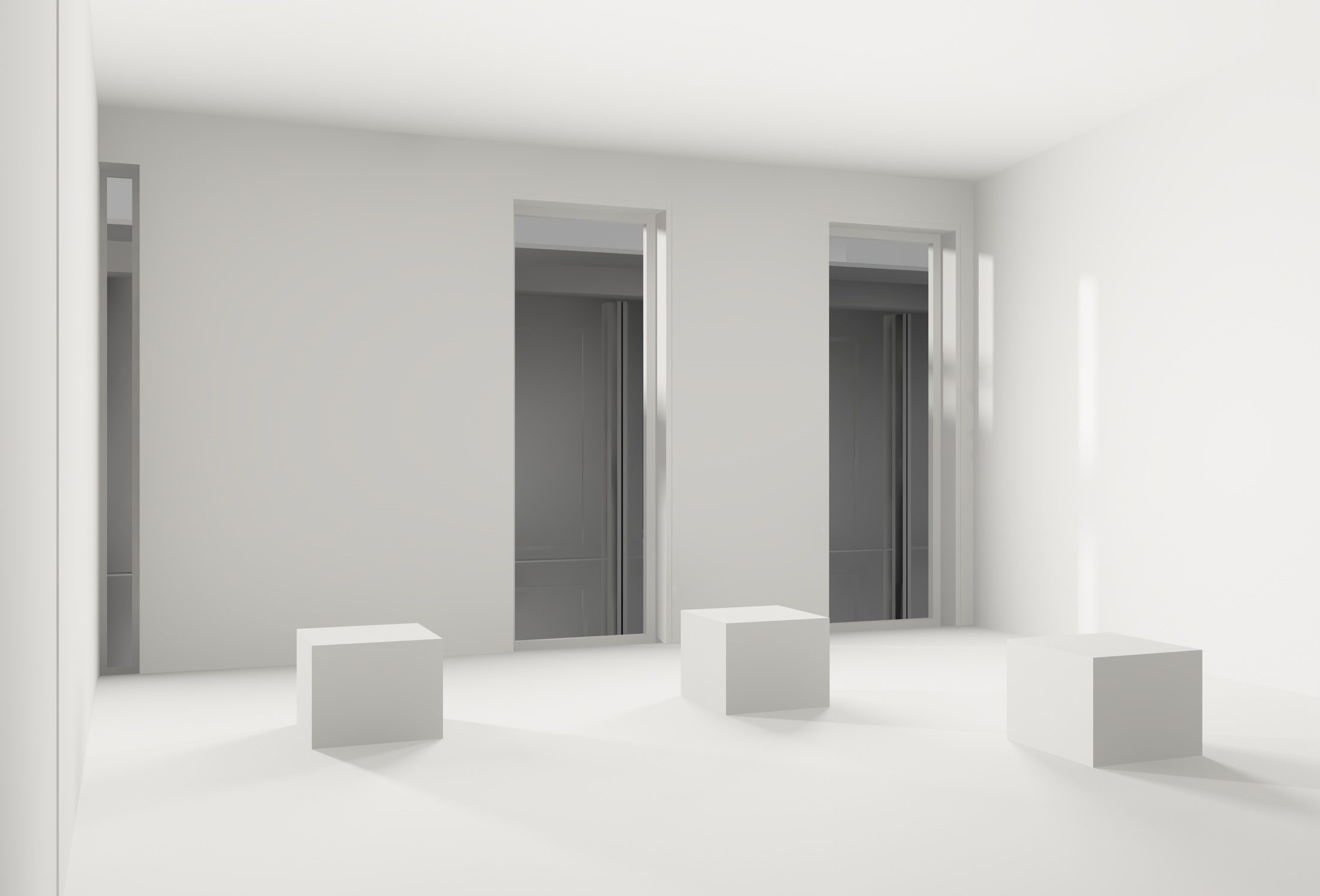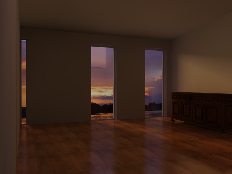 ti allego due rendering, il primo ha le luci area posizionate vicinissime al serramento, l'altra invece è vicinissima al filo del muro, se noti hai ombre diverse, sopratutto sulla parete che la telecamera guarda, vedi quale preferisci, e gioca con il colore della luce per simulare l'alba.