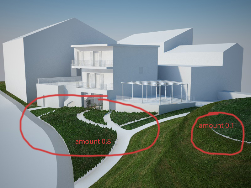 Dopo aver lavorato sull'illuminazione sono passata ai materiali e già qui i primi litigi con l'erba, ho letto in varie discussioni che per grandi spazi è preferibile usare un' erba con displacement e così sto provando a fare ma come potete vedere non mi sono chiare alcune cose: