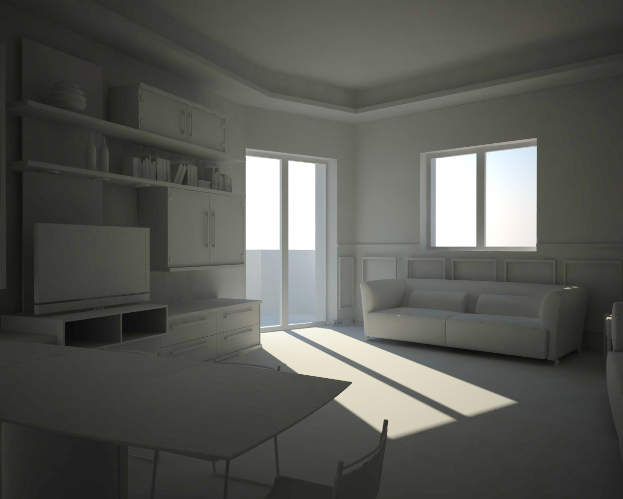 Salve a tutti sto progettando un'appartamento e mi trovo a renderizzare il salone, ancora non ho impostato i materiali, per il momento volevo qualche consiglio sull'illuminazione, ho usato una luce infinita con target il centro del salone, phisical sky e sun.