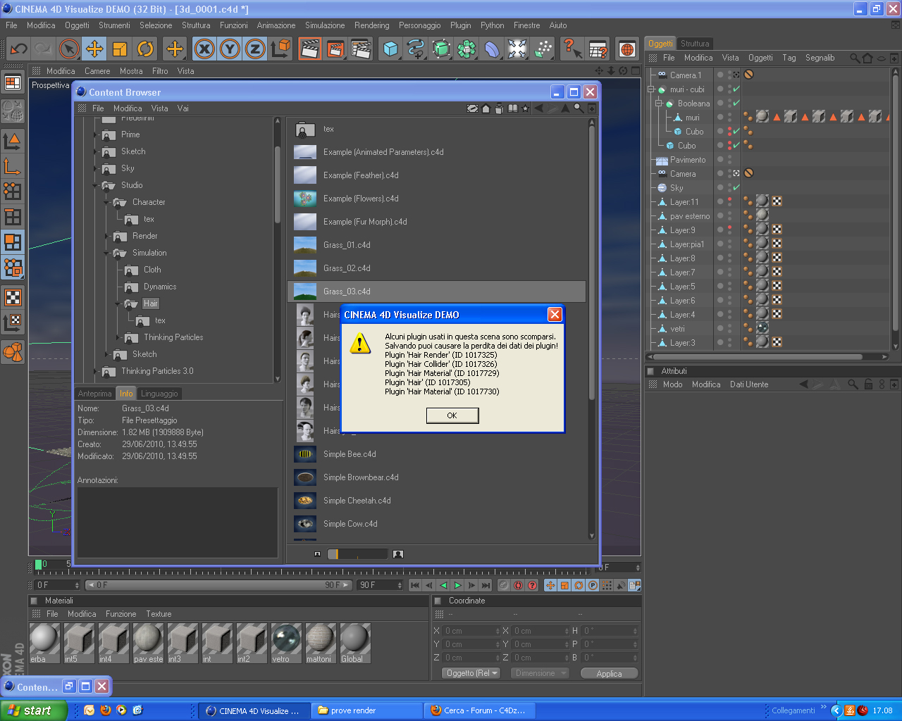 dal content browser - studio - simulation - vorrei inserire nel mio file - hair (per smanettare con l'erba), ma mentre lo apre mi esce la dicitura "alcuni plugin in qst scena sn scomparsi ..." e fa così anche per altre sezioni di simulation come dynamics e tt le altre..