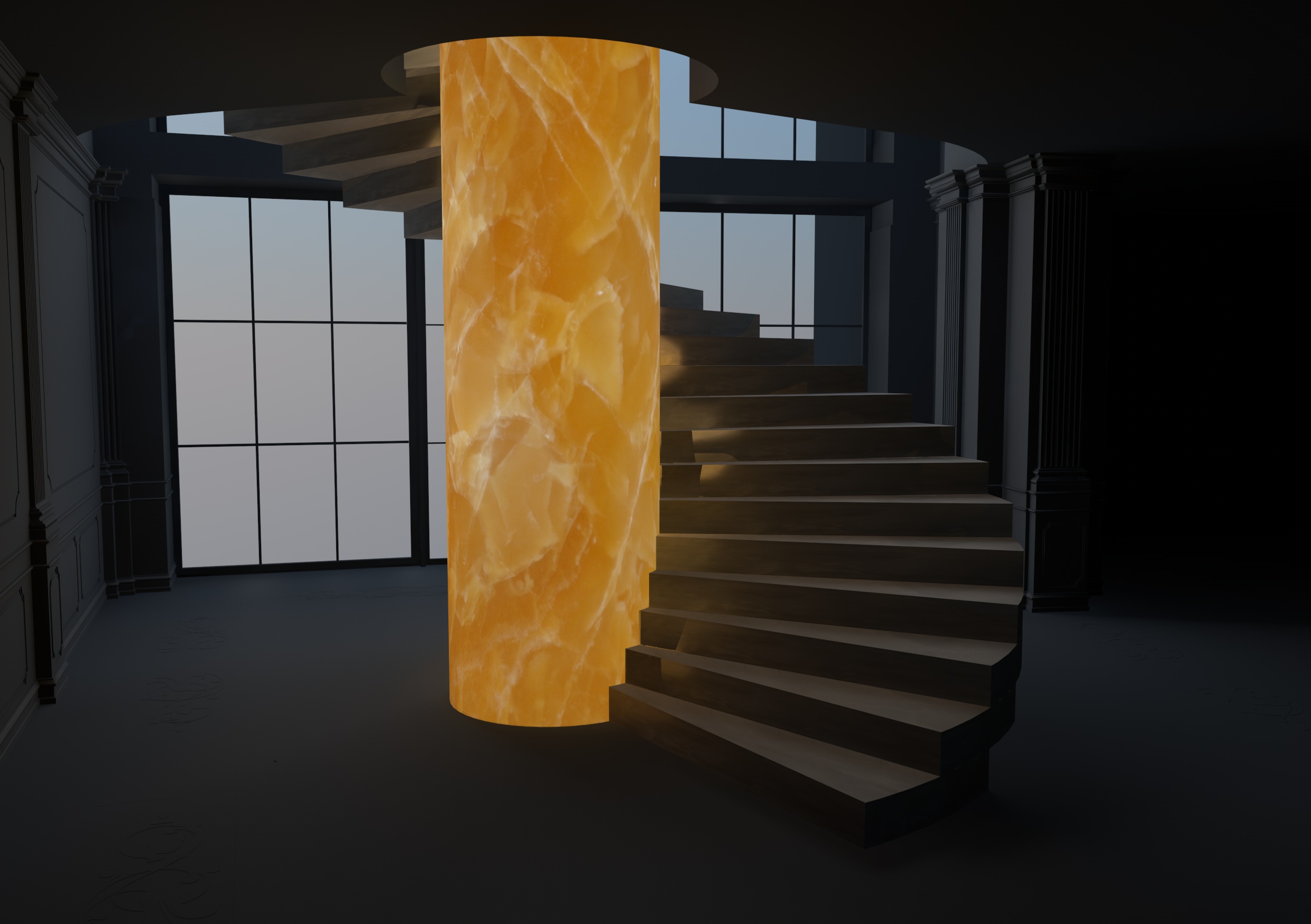 allego altro wip con una luce ad area cilindrica inserita nella colonna, luce gialla, con ombre un pelo più scure...dovrebbe simulare il plexi illuminante, escludendo dalla luce il cilindro in onice...va un po' meglio, ma credo che manchi ancora qualcosa