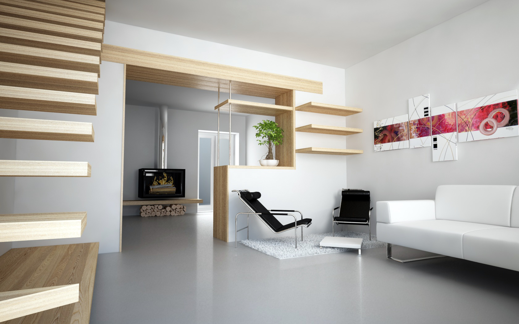 Ad ogni modo il fuoco è un poster in tutte e due; nella seconda le poltroncine nere ed il tavolino sono mignon, controlla le proporzioni; il pavimento cos'é resina? Rendilo un pochino più disomogeneo mettendo un disturbo sia nel Bump che nella riflessione sfocata; la luce è buona!