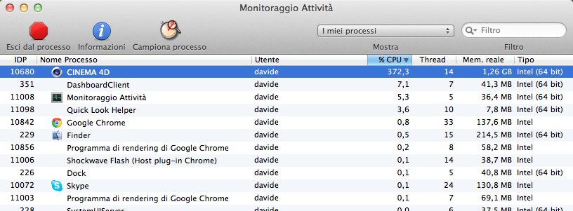 posseggo un macbook pro i5 del 2010, ho installato c4dr13 in prova e quando renderizzo ho queste condizioni: