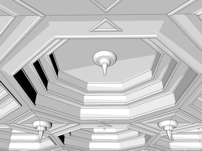 cmq, per il soffitto, io procederei per booleane...ho notato che sono tutte forme regolari i cassettoni, quindi potresti crearti il soffitto con un cubo, creare un oggetto con n lati, quanti te ne servono, moltiplicarlo col mograph, se ce l'hai, se no con il duplicatore, raggrupparli tutti e poi con booleana lo togli dal cubo iniziale.
