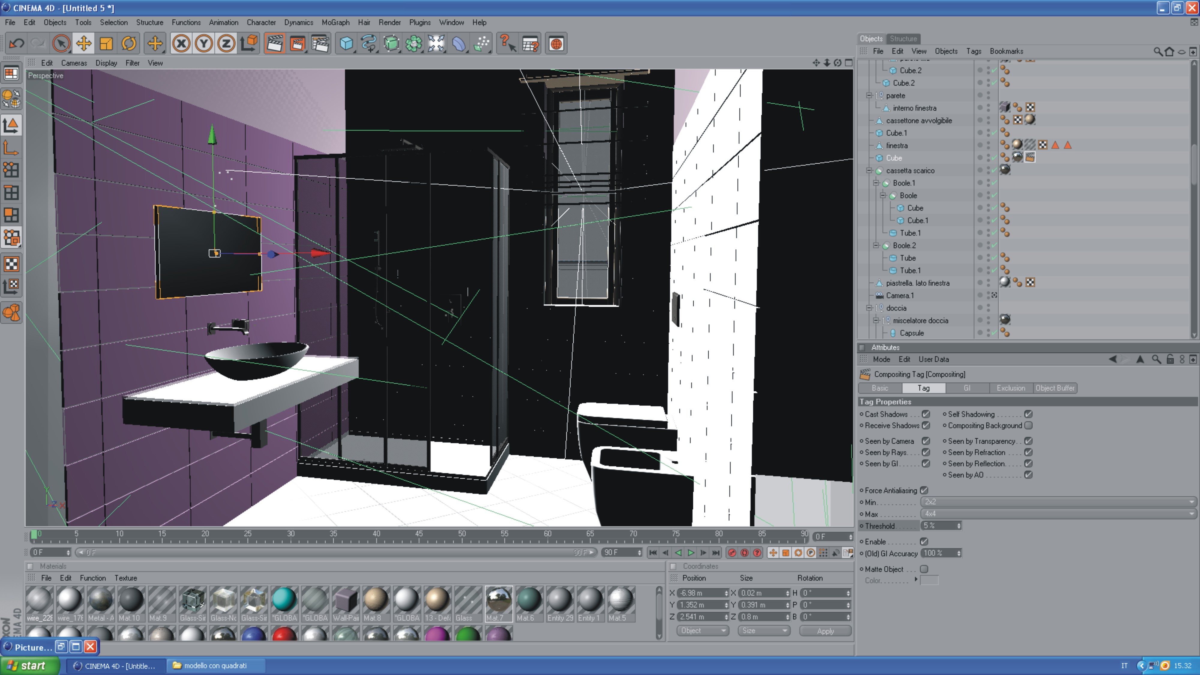 Grazie barlog! ho trovato proprio il lavandino che cercavo! posto un altra immagine, sono andato un po avanti. ho cercato di impostare le luce e migliorato qualche materiale. ancora il modello e il render è pieno di difetti. Per le luci ho impostato una luce infinita intensità 400% ombra area. poi una luce area in prossimità della finestra con decadenza lineare , intensità 100% ombra area, global illumination, profondità 2, luce primaria 110% e luce sec 120%, c'è ancora qualcosa che non mi convince , voi che dite? a dir la verità sono molte le cose che non mi convincono come del perchè il riflesso sullo specchio viene tutto sgranato, consigli per aggiustarlo? ringrazio tutti coloro che mi stanno dando una mano.Balrog ha scritto:prova a dare un'occhiata a ceramiche scarabeo o qualcosa di simile... mi pare che ci sia qualcosa che fa al caso tuo