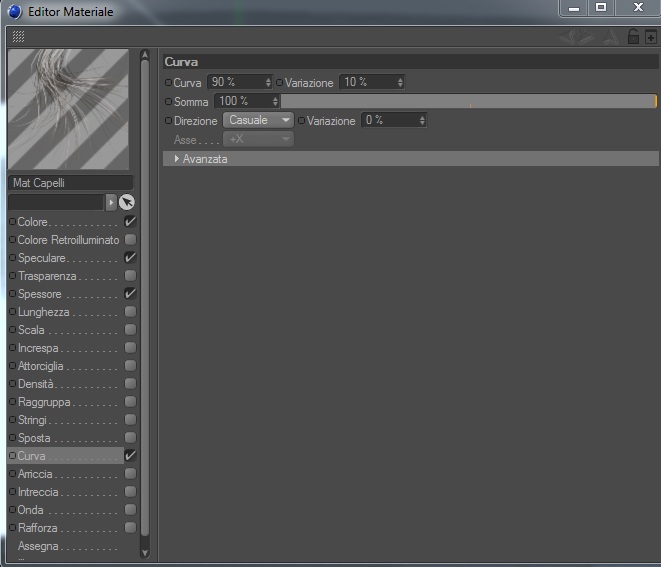 se vuoi il pelo curvo ad esempio, spunti "curva" e aumenti le percentuali vedendo in editor come viene...e così x tutti gli altri parametri..