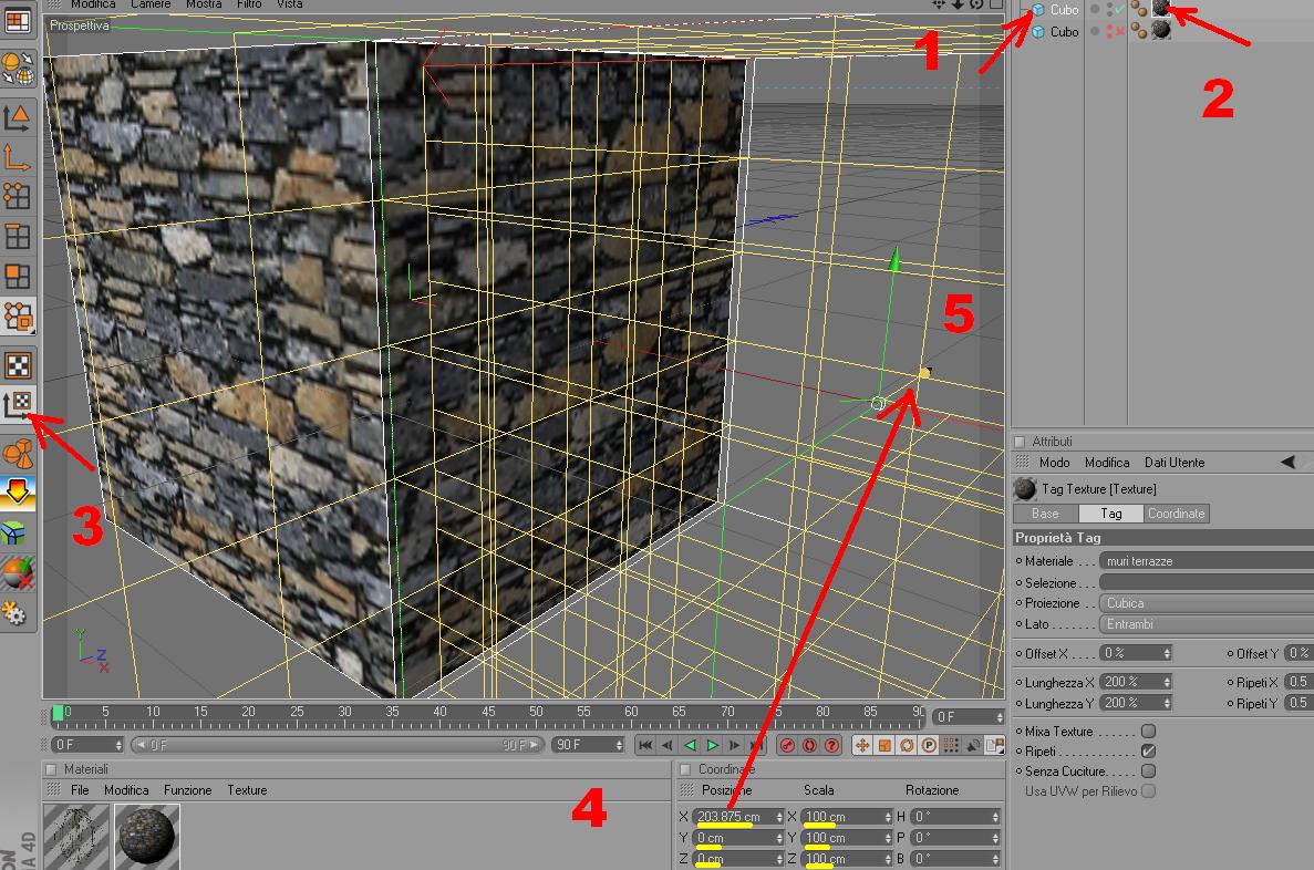 Selezionando: (1) oggetto, (2) tag materiale ed (3) attivando strumento asse texture puoi notare i parametri spostati.