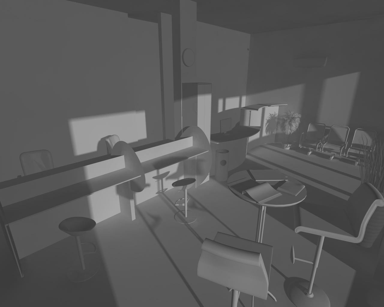 allora ho una luce area alle finestre (senza ombra,con decadenza lineare e intensità al 70%), una luce infinita (con ombre area, intensita 80%) e la GI (int. 80, prec. 80, prof. 6, camp. 200, min 12, max 40).