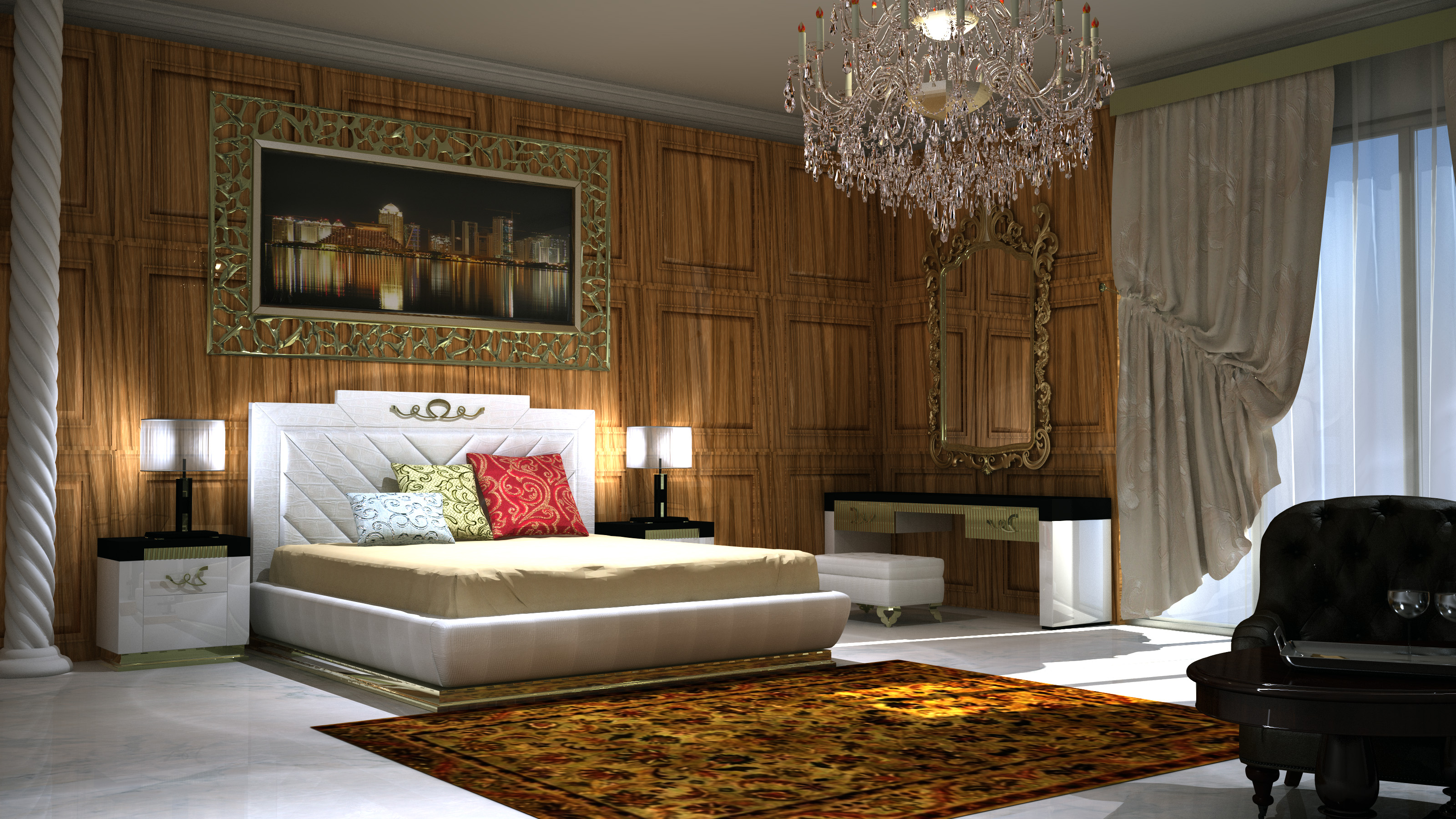 I materiali... la texture della base del letto si ripete eccessivamente e la cosa visibile anche da lontano... opterei per una texture migliore... il pavimento ipotizzo essere marmo ma si nota solamente un bianco lucido... il legno della boiserie come essenza ci sta nel complesso ma è mappato male... in caso fossi stati di fretta potevi optare per un legno più neutro così l'errore magari si notava meno... il laccato di comodi e scrivania ha uno specular eccessivo e troppo netto... ://