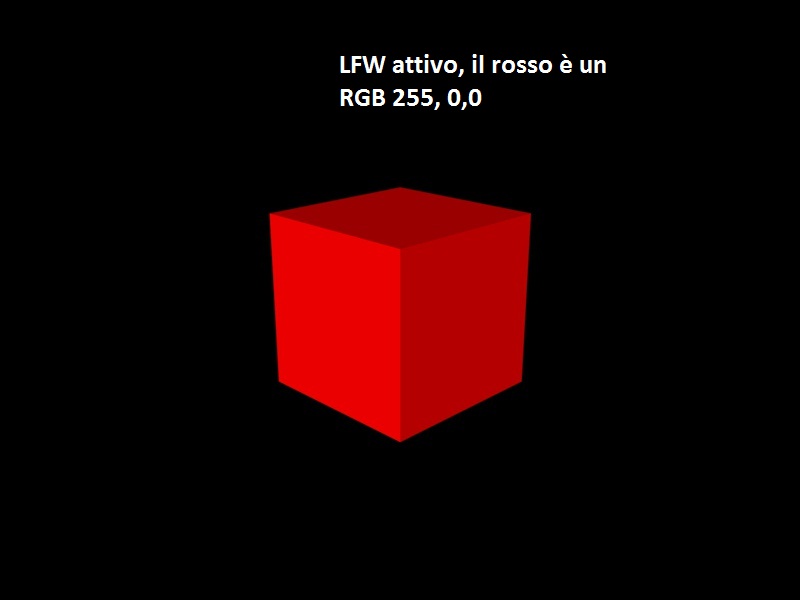 Nelle due immagini seguenti la differenza la vedi tra LFW attivo e non attivo: il colore fisicamente reale è quello con LFW attivo. Prima dell'introduzione di default dell'LFW attivo, i colori che calcolava Cinema erano "giusti" ma li vedevi "sbagliati" a causa dell'interpretazione "sbagliata" del monitor.