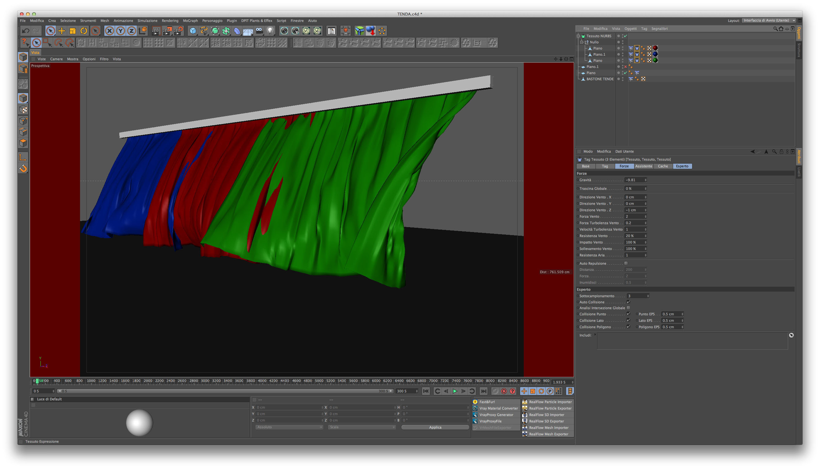 avrei bisogno di animare una tenda..è formata da pannelli, aggiungo il tag cloth, fisso i punti di tutti e 3 e setto i vari parametri per farle muovere..vento, etc...