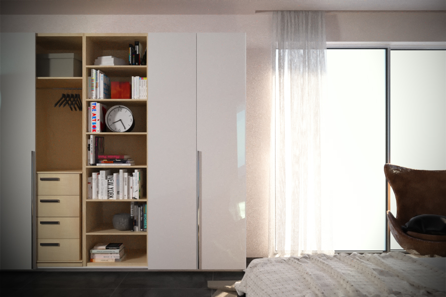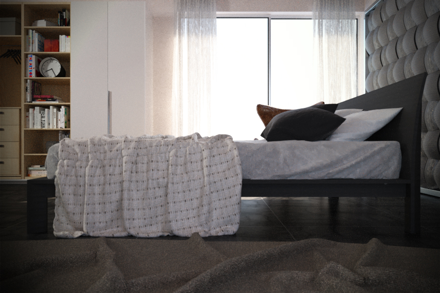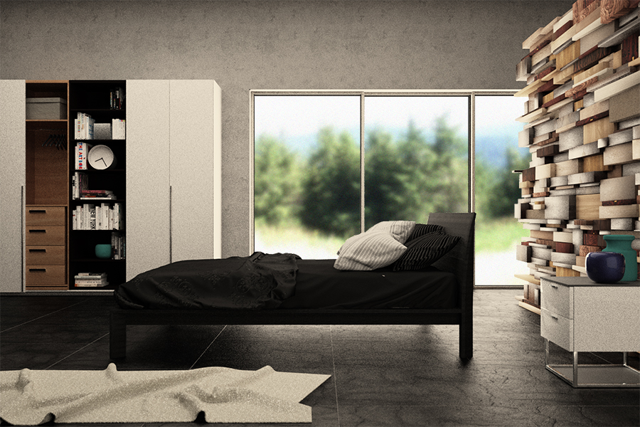 ciao tonno,rivedi alcune tex come la testata del letto,mi sembra ripetitiva,anche se i laminati in commercio spesso lo sono,nell'armadio i divisori interni hanno la tex in orizzontale sul bordo,di solito sono in verticale.I cuscini sul letto non mi convincono nel loro posizionamento.Per la luce è un controluce ci può stare le parti scure,come hai rimarcato te stesso rivedi la tex delle parete in legno