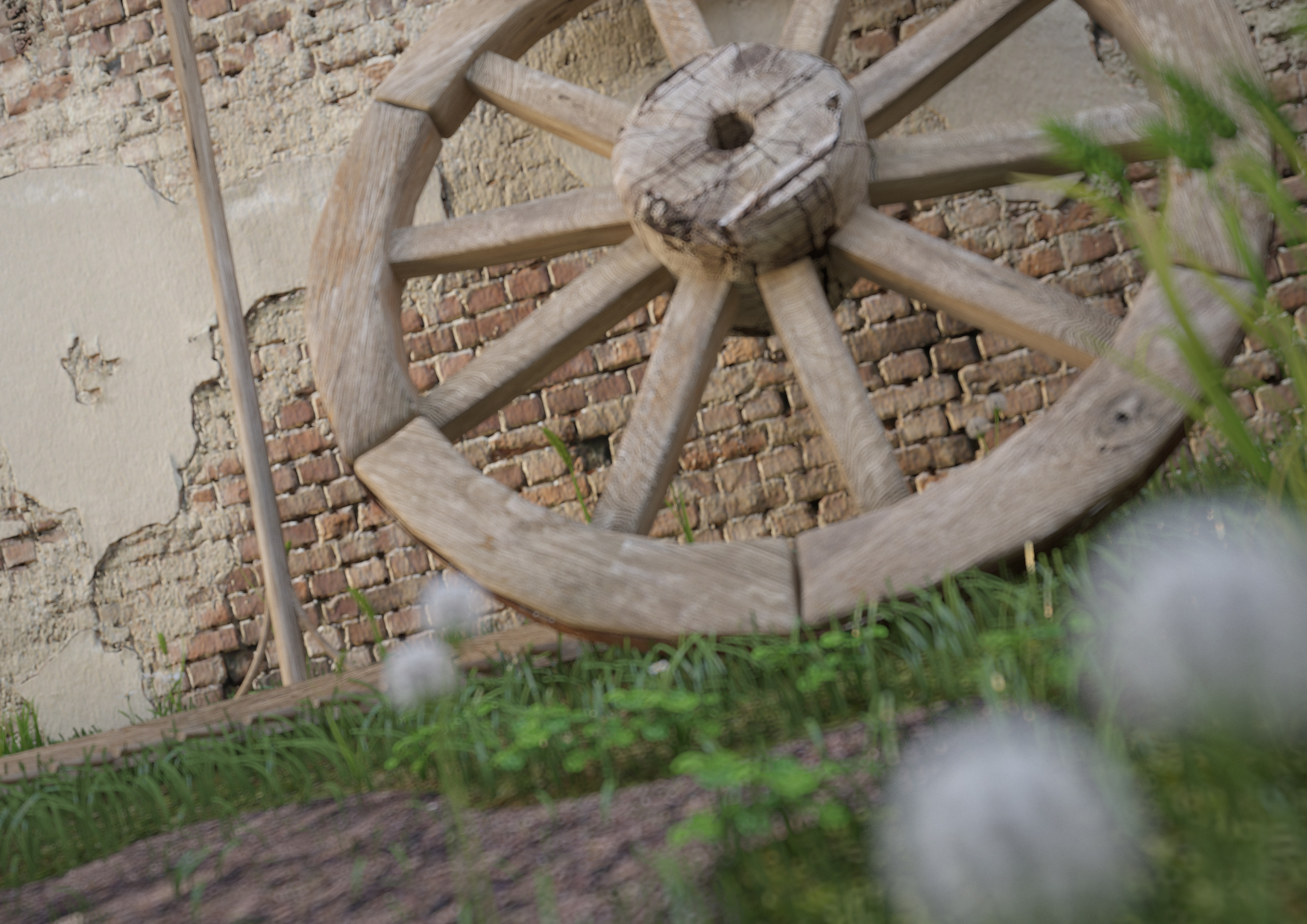 Il render "fotocamera caduta" :) :) :) mi piace personalmente, l'inquadratura ci stà. Però secondo me l'uso delHDRI appiattisce la scena, infatti il muro, la ruota e il rastrello sembra abbiano lo stesso colore, dovuto al fatto che hanno preso la stessa gamma cromatica. Prova con una bella Sun Light e vedi la differenza: secondo me la scena ci guadagna.