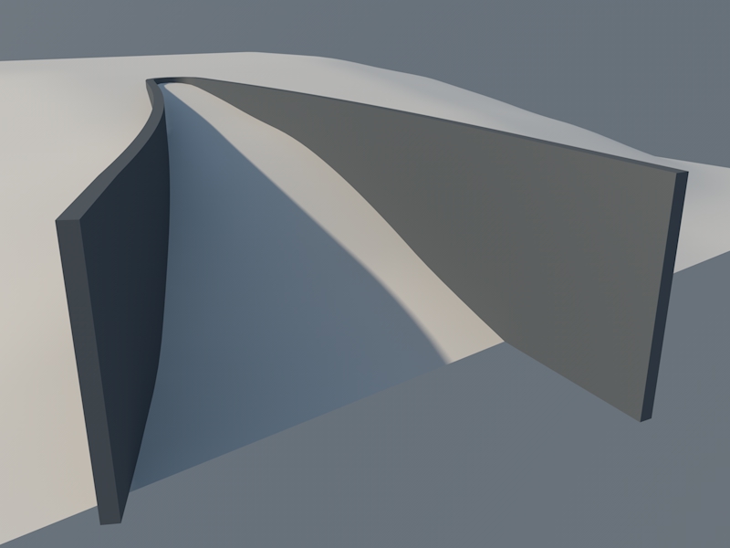 ho creato questa immagine con una Bezier NURBS e un Cubo deformato da due Bend.... vorrei avere un consiglio su come eliminare la parte della Bezier Nurbs compresa tra le due "ali" del Cubo!!