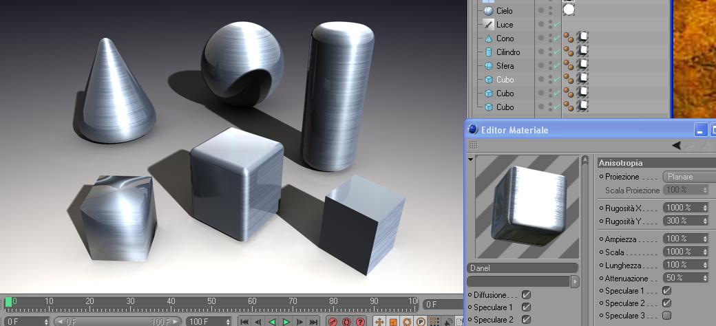 ho fatto una prova con lo shader daniel (con i colori virati verso il grigio per vedere meglio). Le due scene posate sono una con i parametri di anisotropia planare di default e modificati. La proiezione per i vari oggetti è ininfluente (ho usato cubica, sferica, piatta, frontale!). Sono i parametri che influenzano l'effetto. Inoltre se i due cubi in basso quello a sx ha il tag phong a 180°, mentre quello a dx è a 0°.