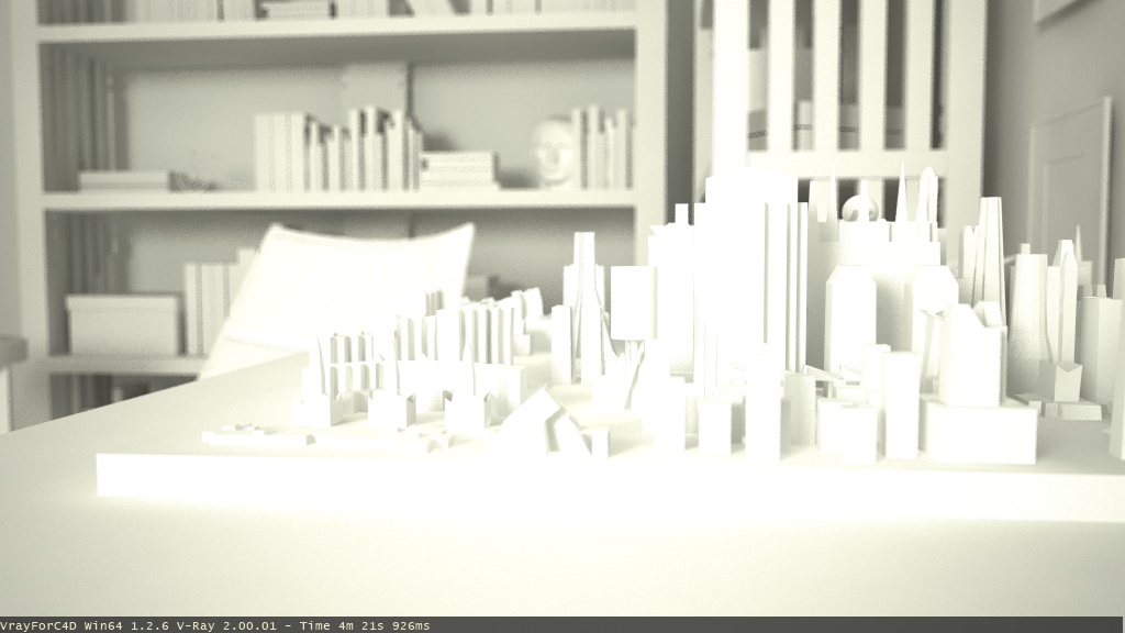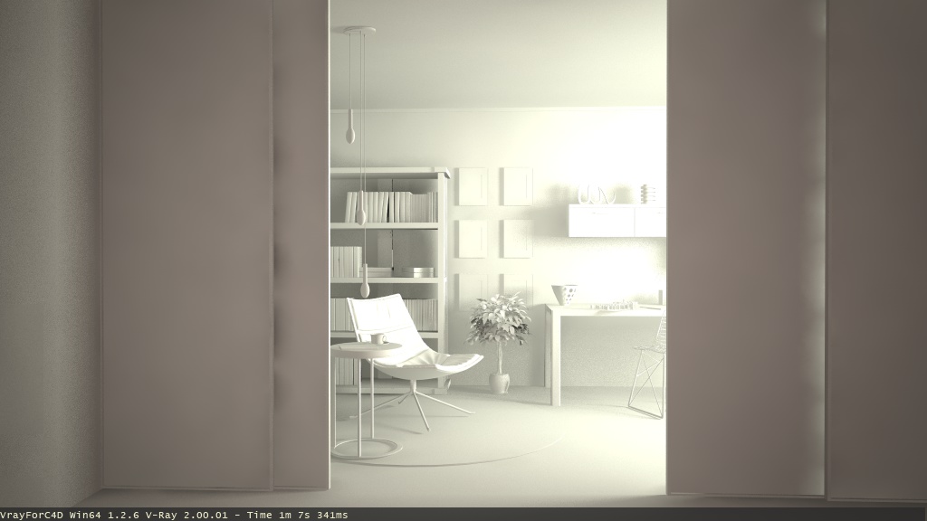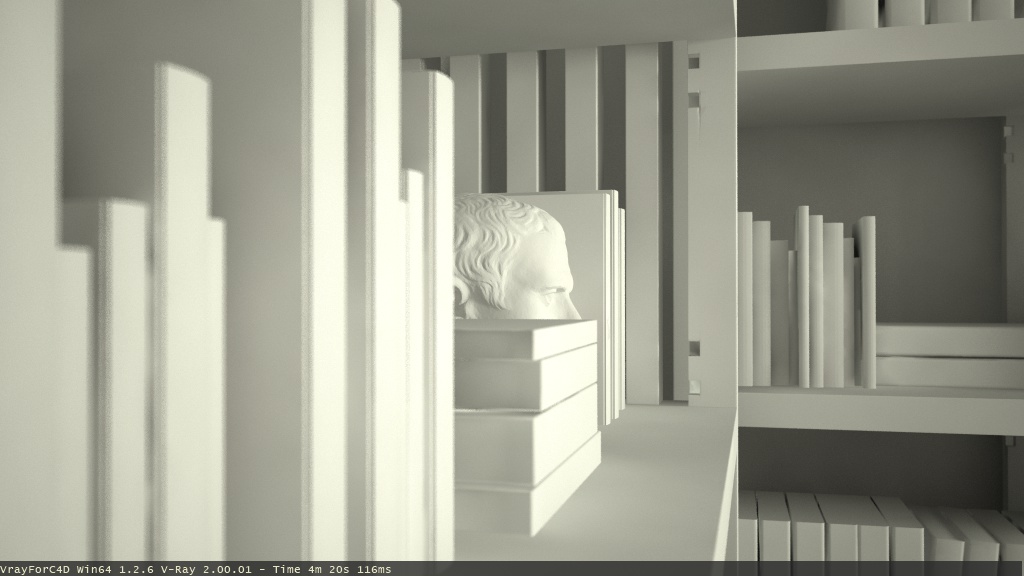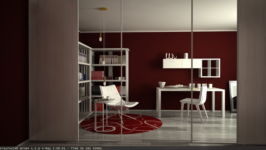 Piccolo upp....ho mappato un pò i libri per la libreria aggiunto qualche oggetto.....ho aggiunto qualche texture per verificare se l'illuminazione funzionava....il tutto è semplicemente illuminato da una luce area alla finestra intensità 70 poi Phcam 150 4 70 parametri di rendering da test ora sono un pochetto di fretta appena riesco posto bene tutto parametri compresi al prossimo up
