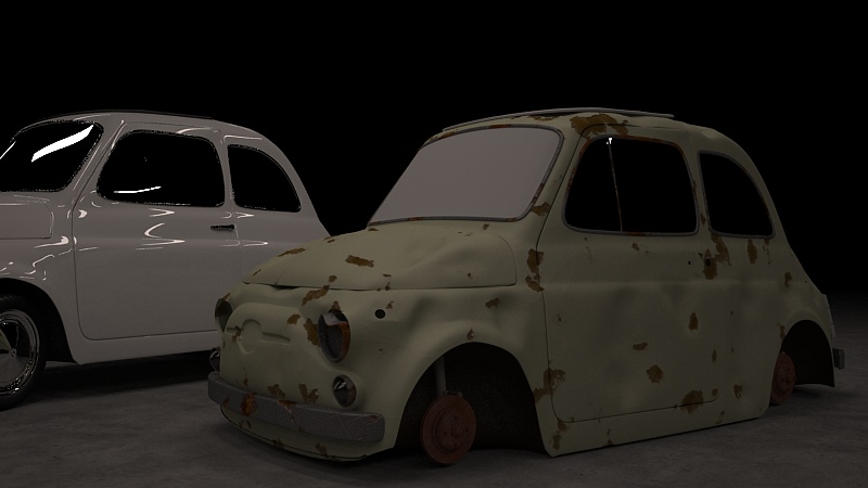 Per il materiale, se ci fai caso, nel mio file ho usato anche il canale bump ( seppur un po a caso ) per generare delle micro fratture nella vernice e per dare la sensazione di rigonfiamento. Per la texture "sporca" poi, potresti aggiungere l'altro canale "diffuse" (nel mio file adesso c'è un hdri) sempre con la ruggine, variando la frequenza e rendendolo +o- visibile aumentando l'amount del diffuse layer trasparency del primo ...