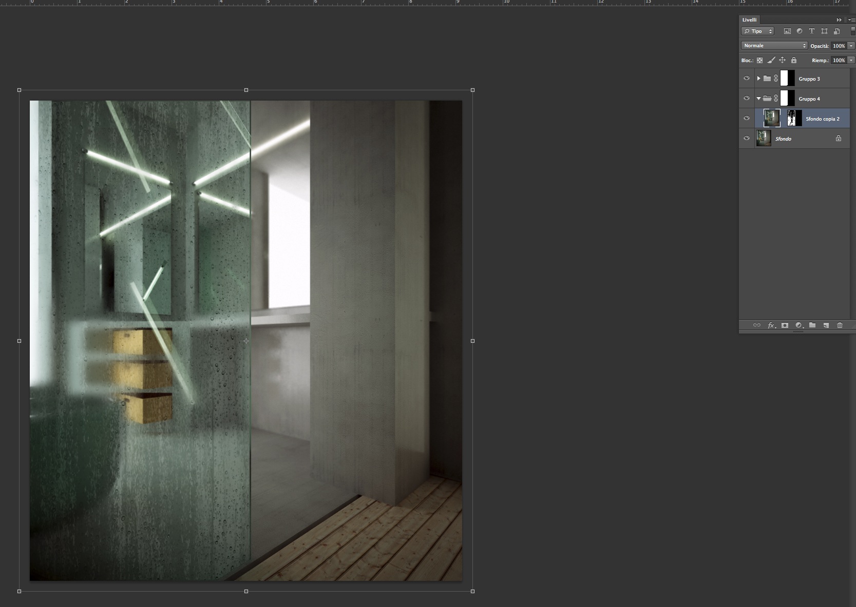 Tipo Goccioline o simile, in modo da simulare appunto un pò d'acqua o un pò di condensa sul vetro come se uno si fosse appena fatto la doccia. vi posto la mia scena e se qualche anima pia ha qualche suggerimento apprezzo volentieri bella li