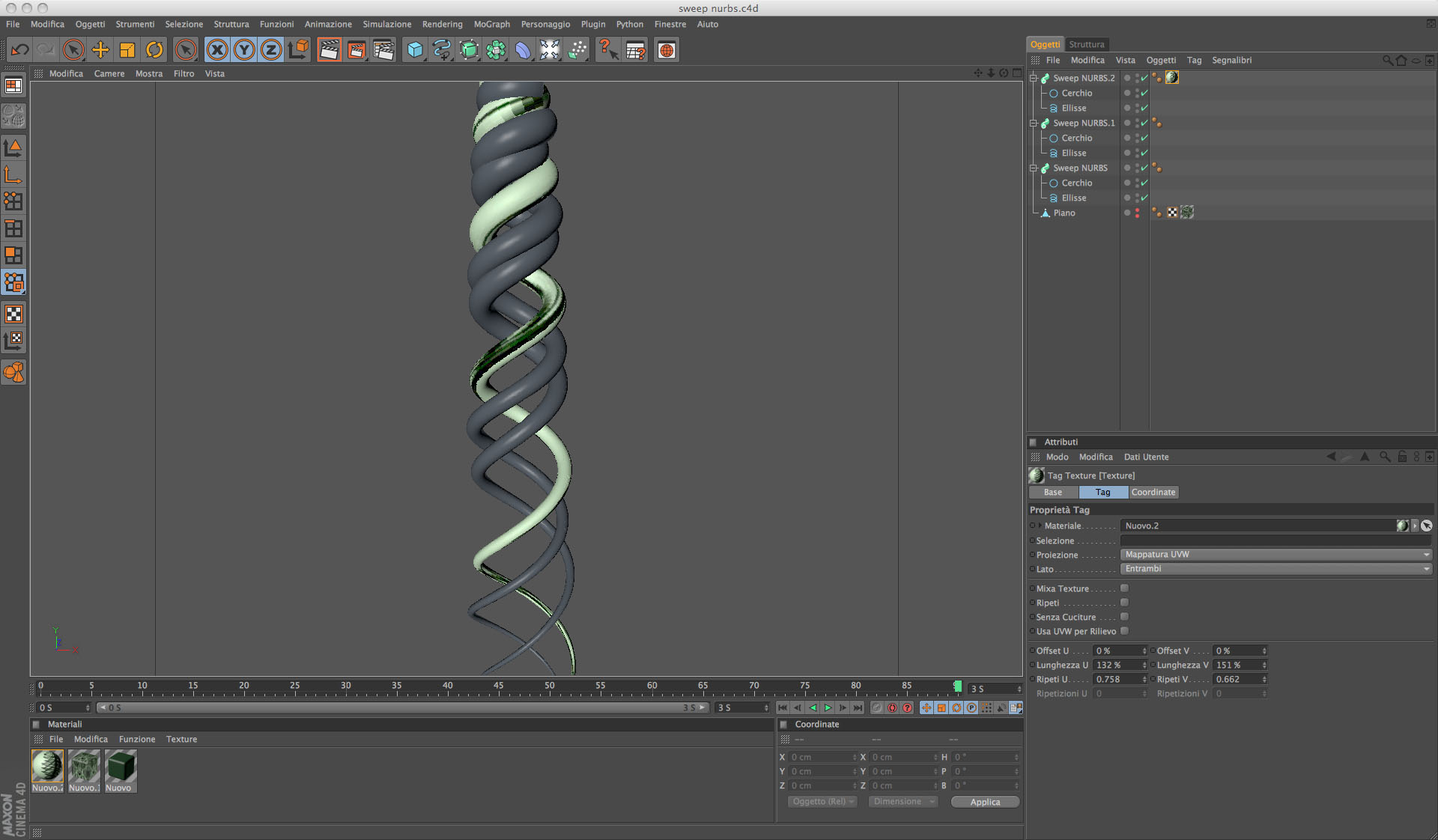 Ho realizzato la semplice animazione di 3 radici (3 tubi che terminano + sottili, realizzati con spirale+cerchio in sweep nurbs) che crescono aggrovigliandosi tra loro, ora devo dargli una texture grafica che ho preparato, ma in nessun modo riesco a fargliela aderire correttamente, a meno di non editare gli oggetti sweep nurbs perdendo l'animazione.