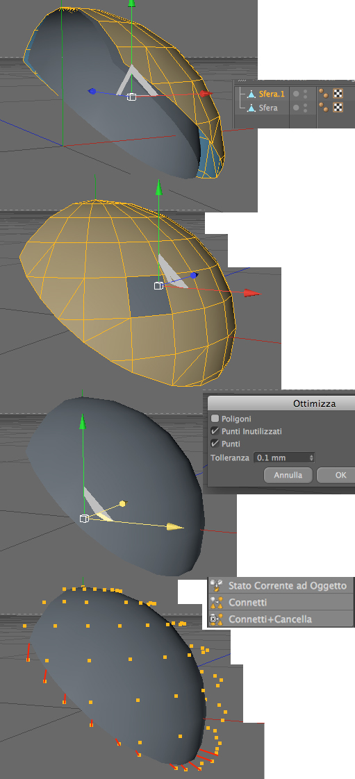 - Ho due semisfere convertite di cui una più grande che cosituirà, dopo averne cancellato i poligoni, il percorso su cui connettere i suoi punti con quelli di quella più piccola