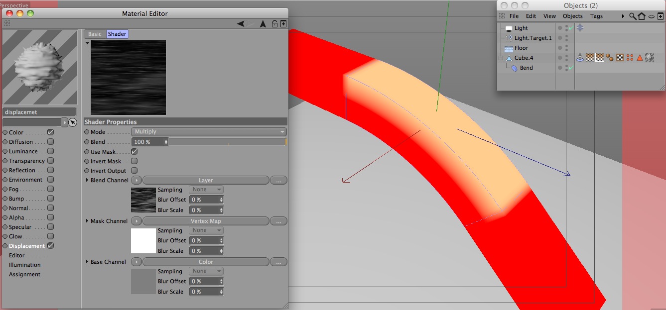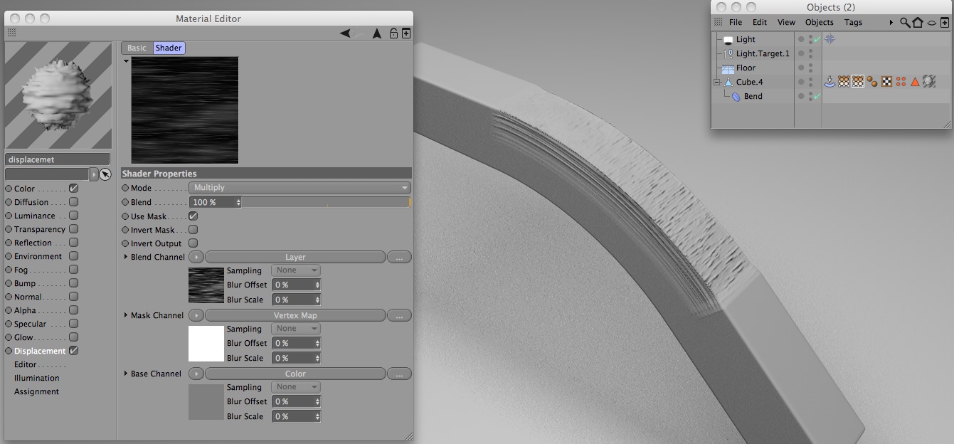 La scena dovrebbe rappresentare un movimento tettonico di una stratificazione di roccia. Entro nello specifico: immaginiamo un parallelepipedo sottoposto al deformatore "piega". L'oggetto in questione si arrotonda sull'asse di rotazione del deformatore (spero di aver reso l'idea) diventando a forma di banana. Questa deformazione è abbastanza basilare nella sua esecuzione e fin qui non ho trovato alcun problema. Però l'effetto che vorrei dare al parallelepipedo e quello della fratturazione nella parte esterna della piega dove la roccia tende a fratturarsi in quanto non elastica.
