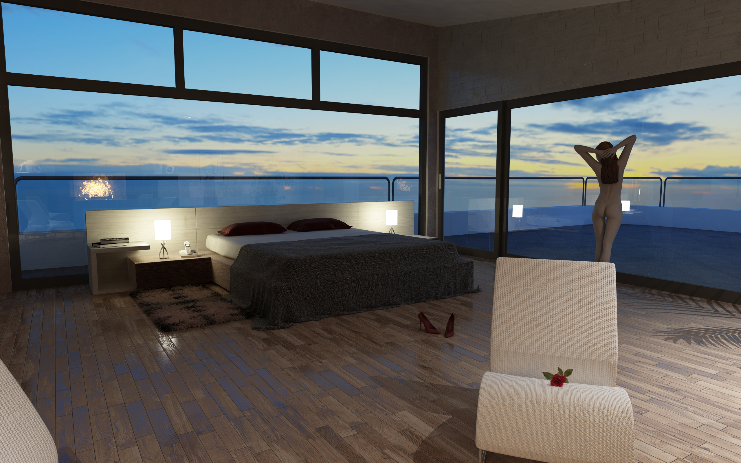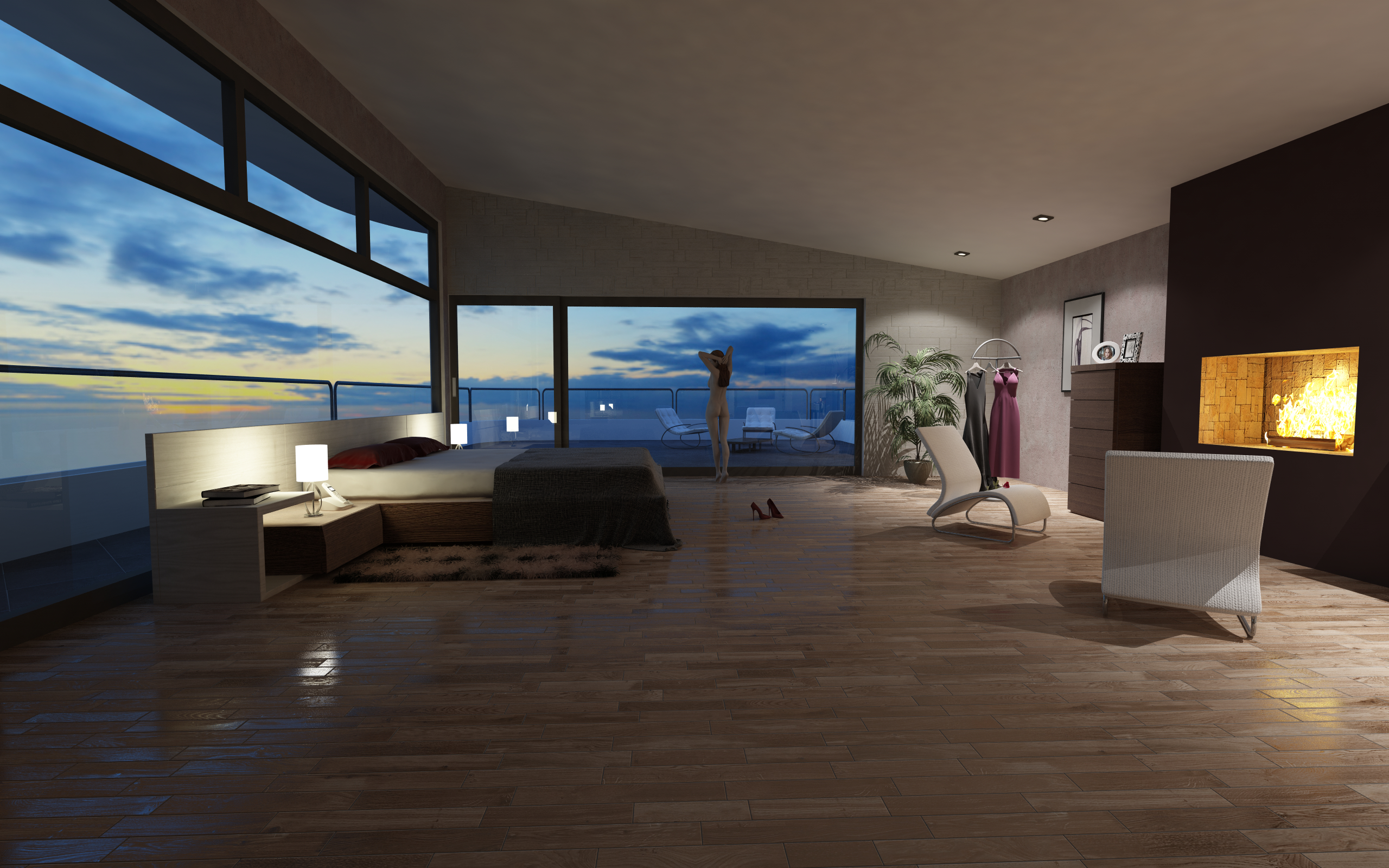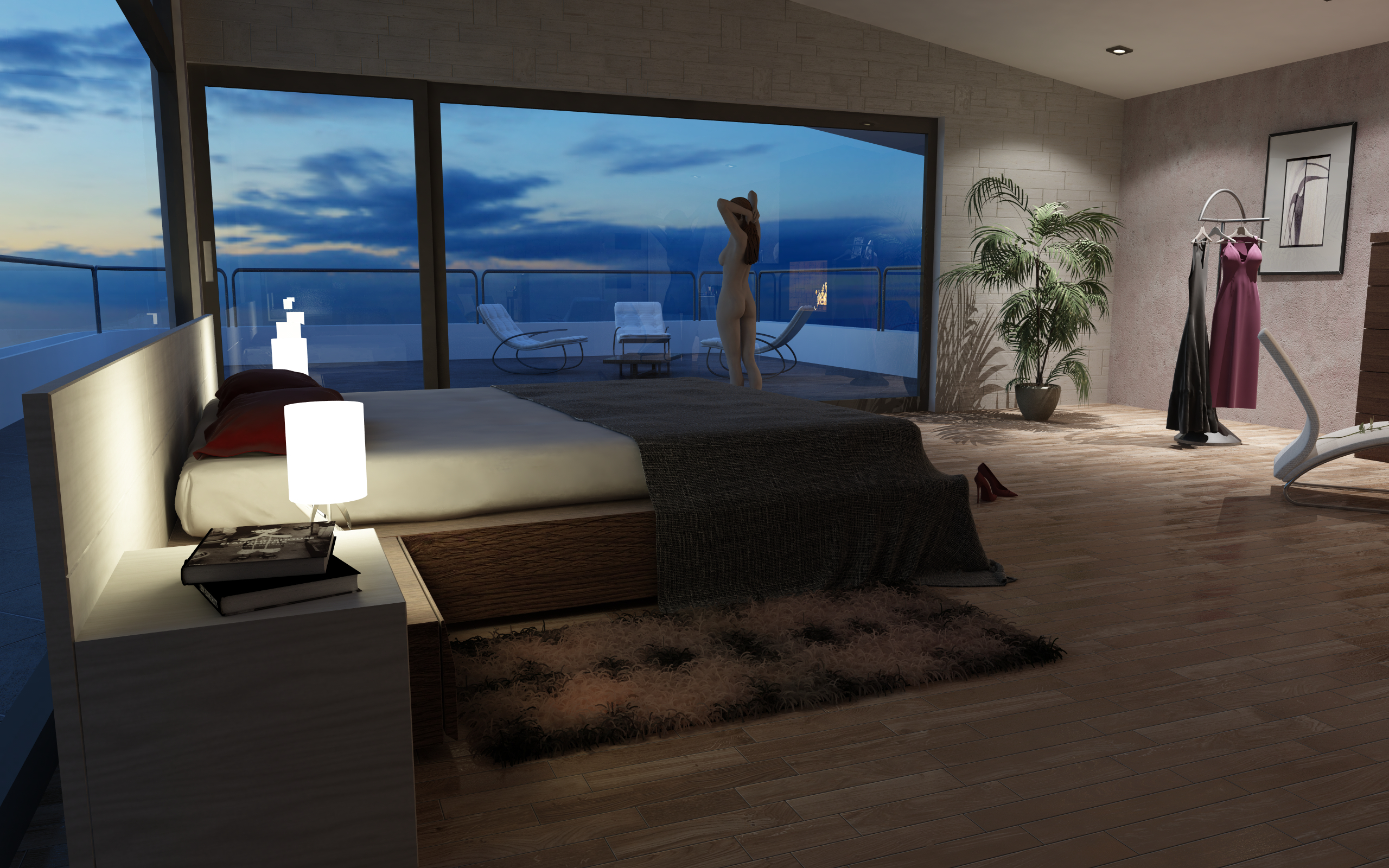 Scherzi a parte è il mio primo lavoro in "notturna", all inizio volevo illuminare la scena solo con il multiplayer dell env e la luce del camino (materiale autoilluminante) ma poi ho aggiunto le abat jour e le IES per i faretti. Prima volta anche nell uso della mappa di riflessione (pavimento e pareti in pietra) e fresnel (lenzuola, materasso, vestiti e legno in generale). Il tappeto l ho fatto con il fur ma non mi convince tanto...non so se per il tipo di tex che gli ho messo o qualcos altro.