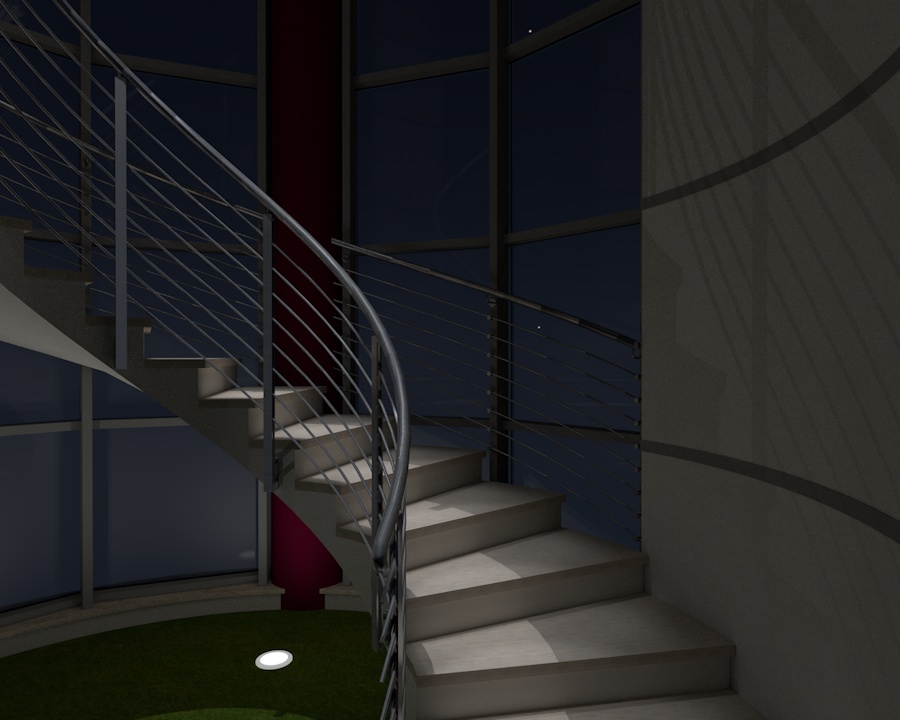 Ecco l'immagine. Ho utilizzato esclusivamente luci ies prelevate da internet. In cima al vano scala c'è una luce molto potente ma la sua ombra quasi quasi annulla l'illuminazione "globale" prodotta dai due faretti posizionati sotto alla scala e rivolti verso l'alto. Grazie ancora