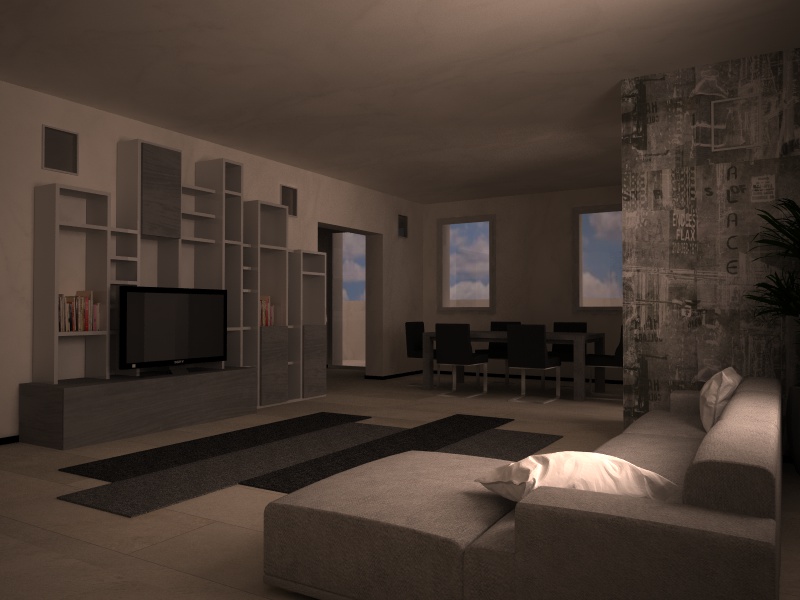 che tu abbia usato il cielo, fisico o non, luci area o altro, é evidente che la stanza é molto buia.