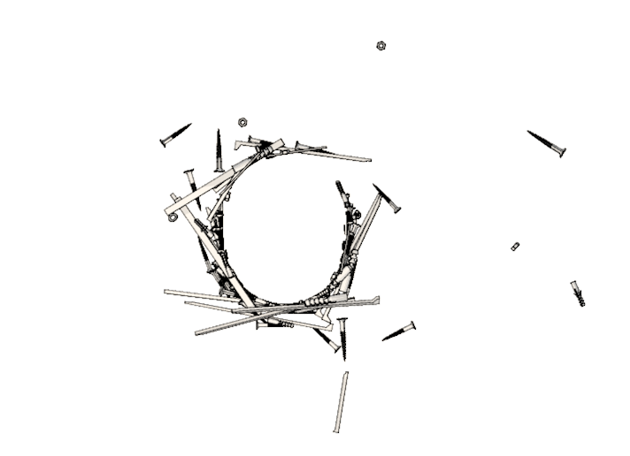 Ho creato un testo estruso, "disteso" su un pavimento, l'ho reso un collider body e le viti rigid body e ho applicato un attrattore nel mezzo, ma riscontro diversi problemi: