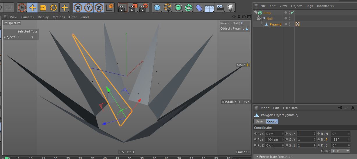 Nota che l'asse dell'oggetto target ( Pyramid ) è posizionato alla base del poligono, questo per far si che il punto di ancoraggio della rotazione sia in basso e non al centro...