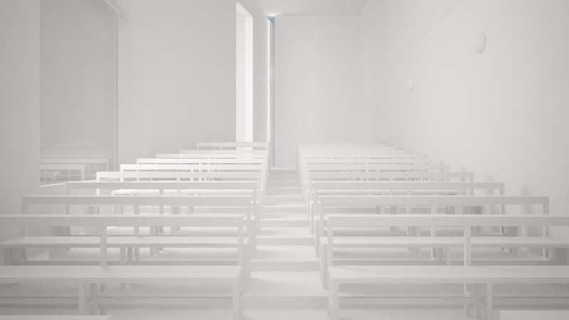 Per ora mi sto concentrando di più sulla qualità della luce che su quella delle texture (le panchine sono bianche perché non ho ancora creato un materiale soddisfacente). Come luce ho messo il cielo e il sole fisico di vray, la camera ha il tag di camera fisica di vray, alle aperture ci sono le solite luci area in modalità normal light perché come portal light non aiutano praticamente per niente l'illuminazione globale della scena.