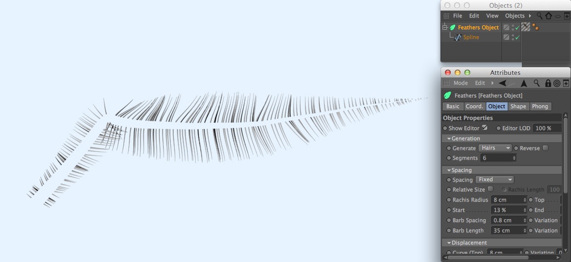 ho pensato di farmene una a mano utilizzando Hair. dopotutto, l'oggetto piuma applica il modulo hair ad una spline gestendo i propri parametri in modo differente, ma il principio alla base é il medesimo.