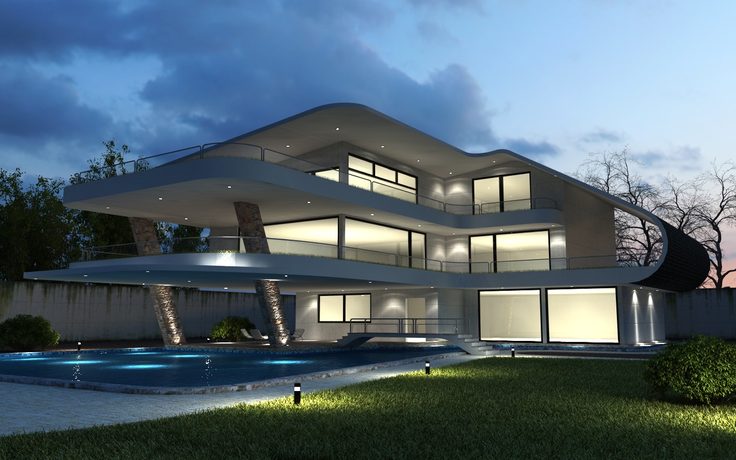 Per quanto riguarda il lato meno tecnico aggiungerei un po' di arredi all'interno, così da aumentare il dettaglio e l'accuratezza, e non accenderei le luci di tutte le stanze, ma solo di alcune, magari al limite puoi provare a tirare delle tende in alcune camere. Infine allontanerei leggermente il punto di vista, la casa è troppo vicina ai bordi dell'immagine e sembra un po' schiacciata, se gli dai più respiro ai lati secondo me ne guadagna.