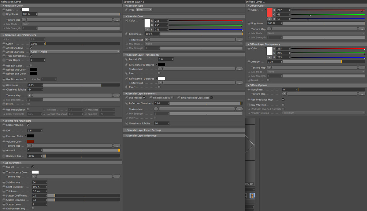 Devi usare il canale SSS all'interno del refraction layer, utilizza rifrazione con volume e assegna valori di trasparenza adeguati nel diffuse channel.
